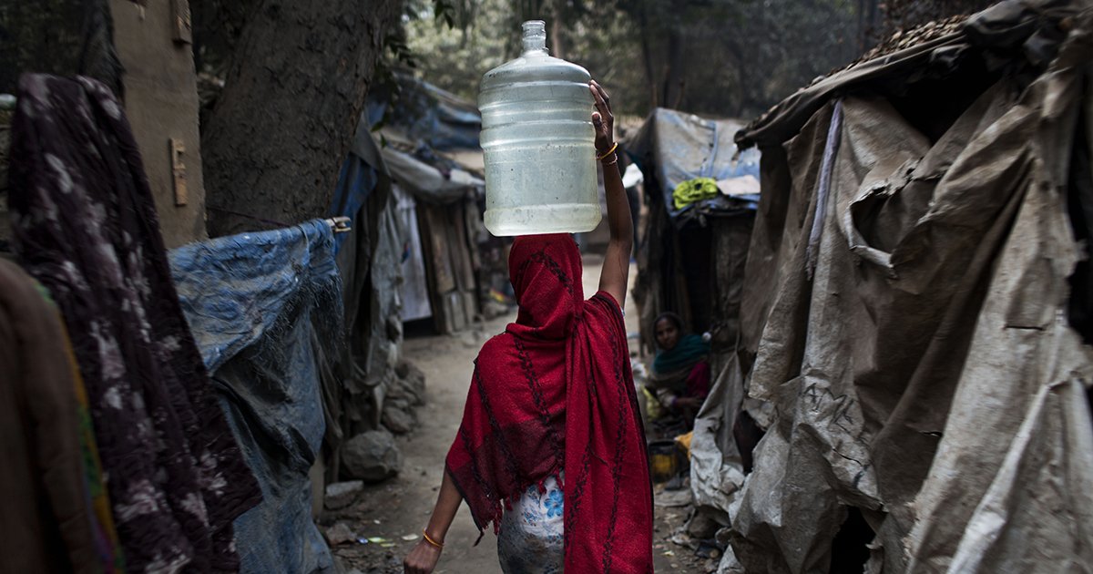 An Indian woman carries a plastic container filled with water in New Delhi in a slum area in New Delhi, India, Jan. 17, 2016.