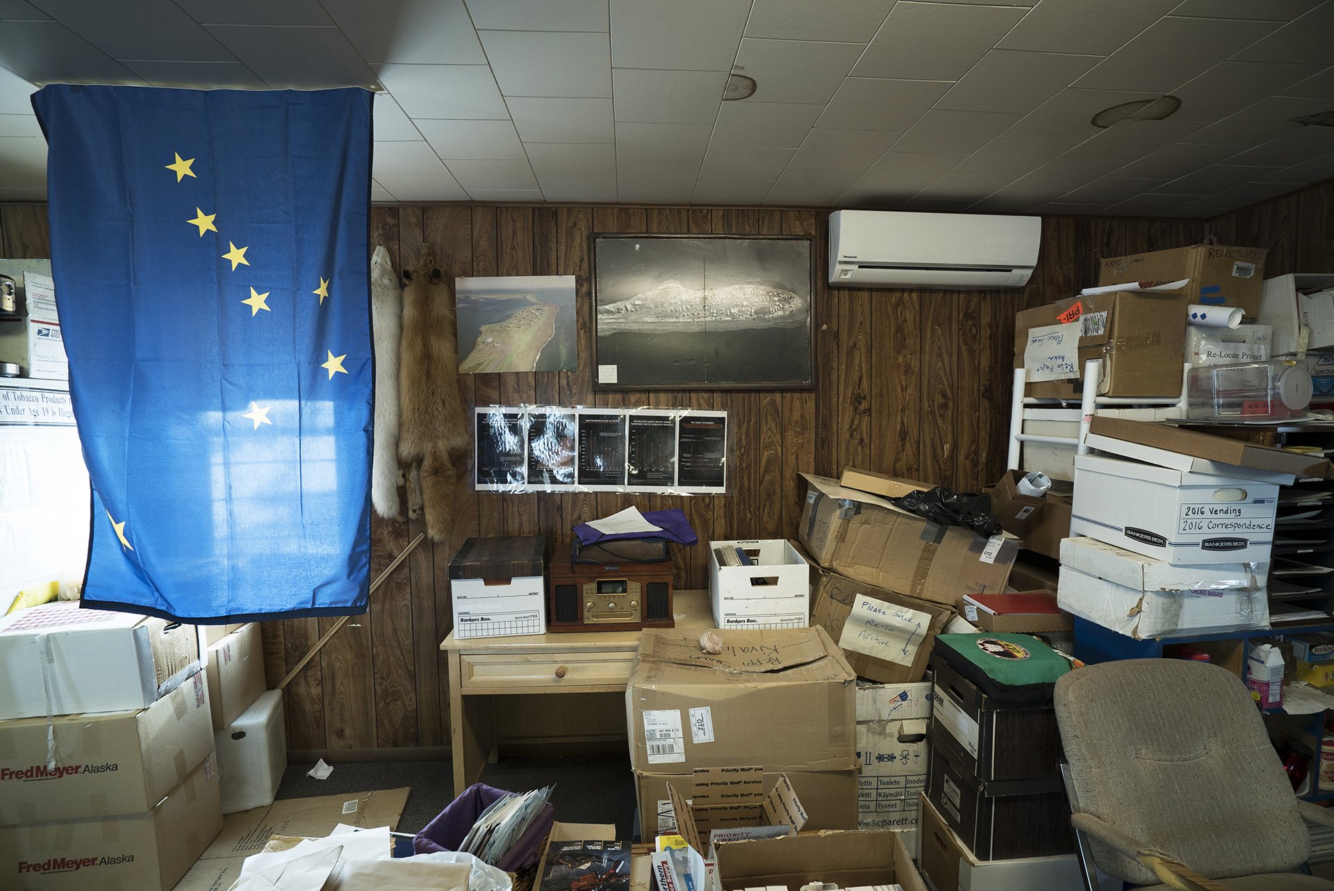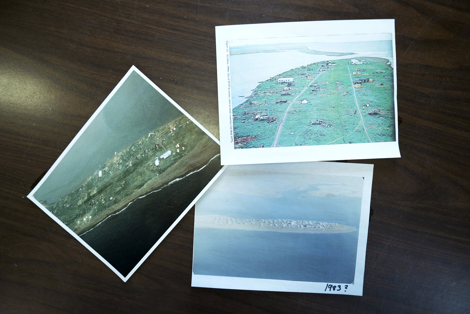 Aerial photographs of Kivalina from decades ago were on the walls, showing how the the island’s coast has receded over the years.