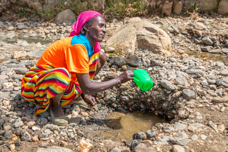 Manase, 40, digging for water in her nearby river in Ale, Ethiopia. The river used to be filled to the brim during the rainy season, but severe drought has forced Manase to dig into the sand to find water for her crops, animals, and family of eight.