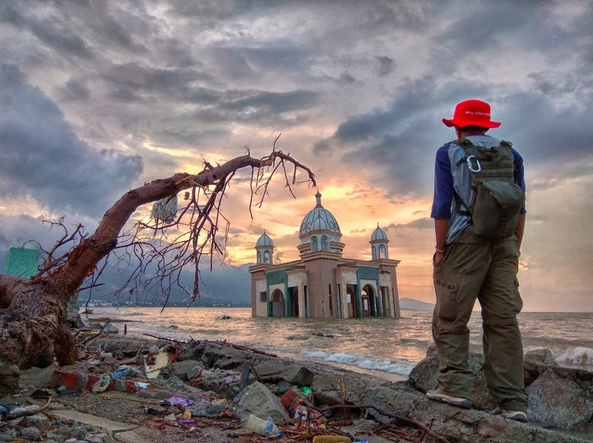 After the Sulawesi earthquake and tsunami in September 2018, which killed more than 4,000 people, Dasci, a Mercy Corps team member stands in front of a floating, and now sinking, mosque. Mercy Corps has become a key player in shaping Indonesia’s climate change agenda, increasing the capacity of 17 cities to evaluate risk and create climate change adaptation plans to improve their ability to respond to the needs of more than 11 million urban citizens.