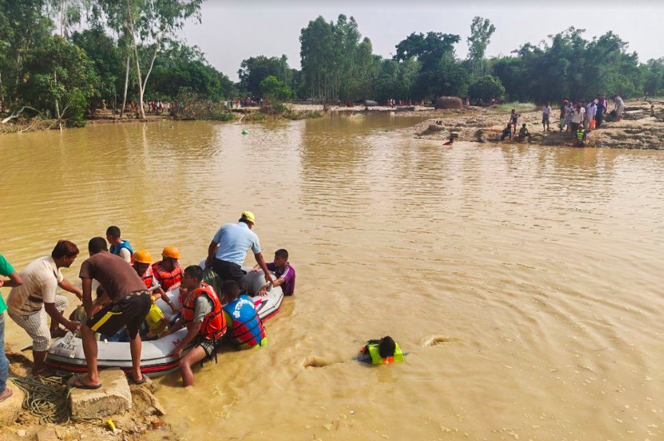 People use an inflated boat to cross an area of Nepal’s Mahottari district inundated by flooding. Landslides and flooding affected 32 districts in Nepal. More than 100 people died from the flooding and 20,000 families were estimated to be displaced in the initial aftermath. Mercy Corps supported more than 1,000 flood-affected families in Nepal, and in 2019 the organization’s humanitarian response teams supported over 200,000 disaster-affected people across South and Southeast Asia.