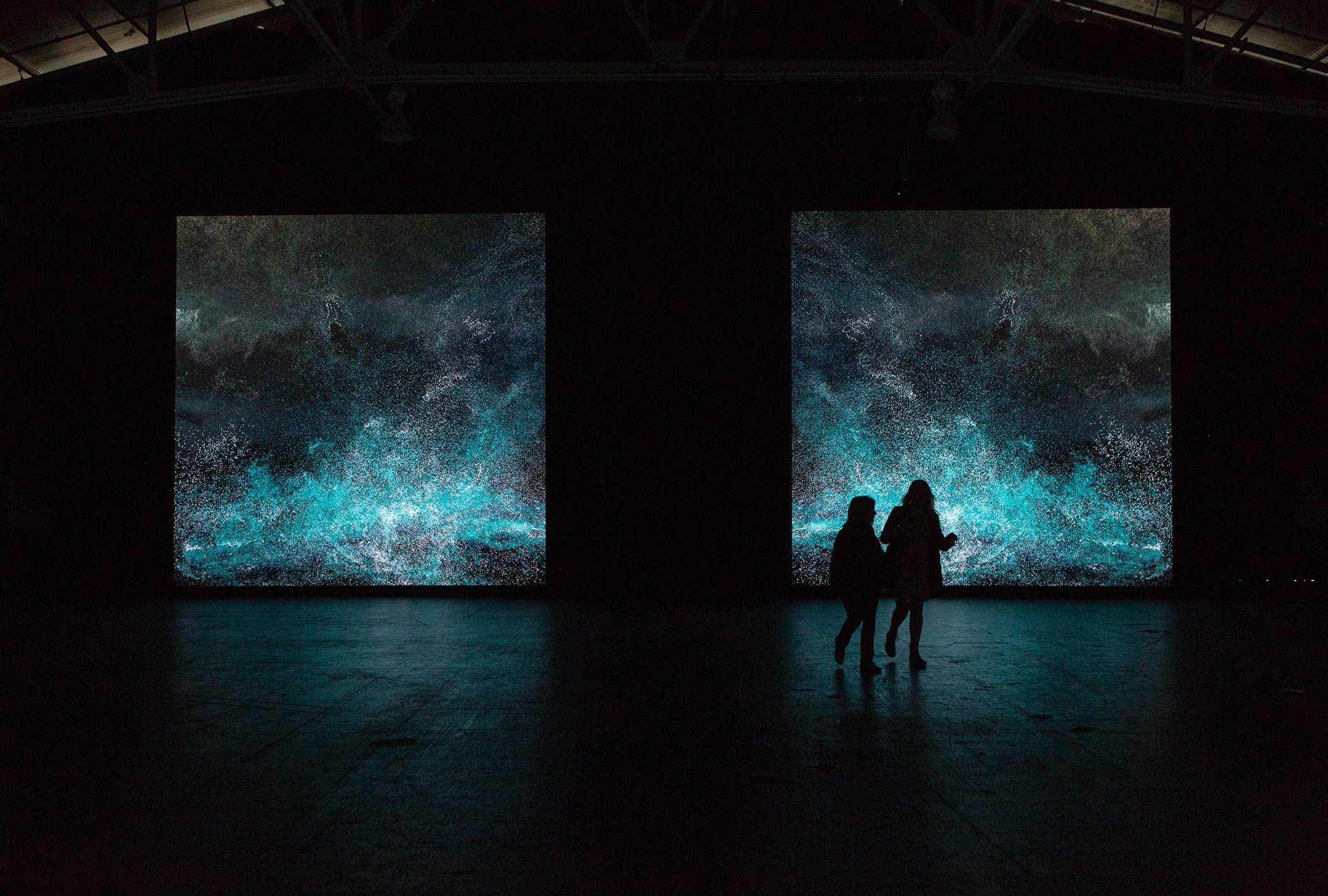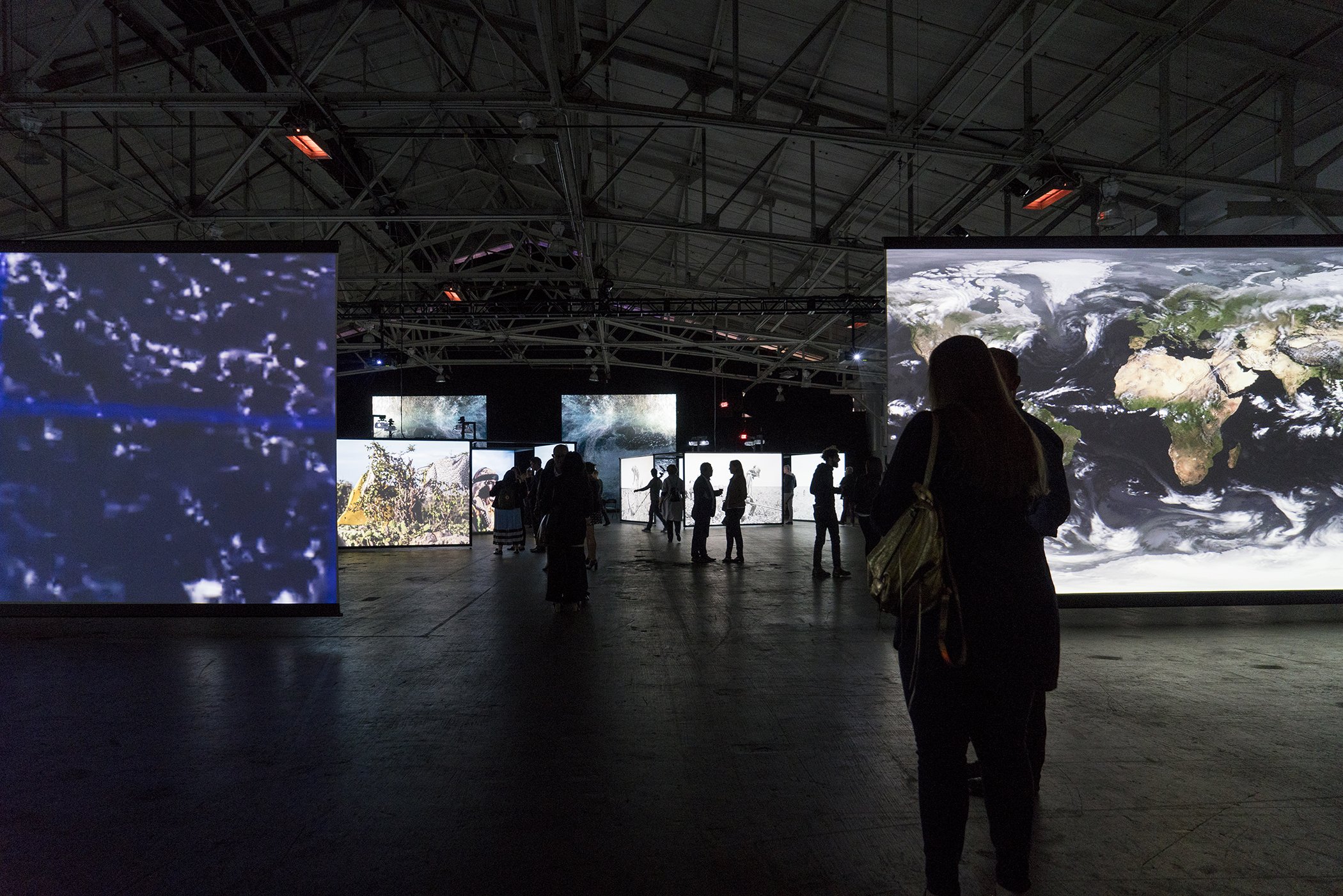 The climate change-related pieces are installed in a vast, 50,000-square-foot space that’s barely illuminated. Most of the light emanates from massive photographs and videos on highly textured screens. Almost no text accompanies the pieces, allowing the images to speak for themselves, and a unique soundscape helps to create a mood for each work. The immersive experience is not unlike walking through a sacred space, and visitors are encouraged to chart their own journey as they encounter highly charged scenes of environmental devastation and human portraits.