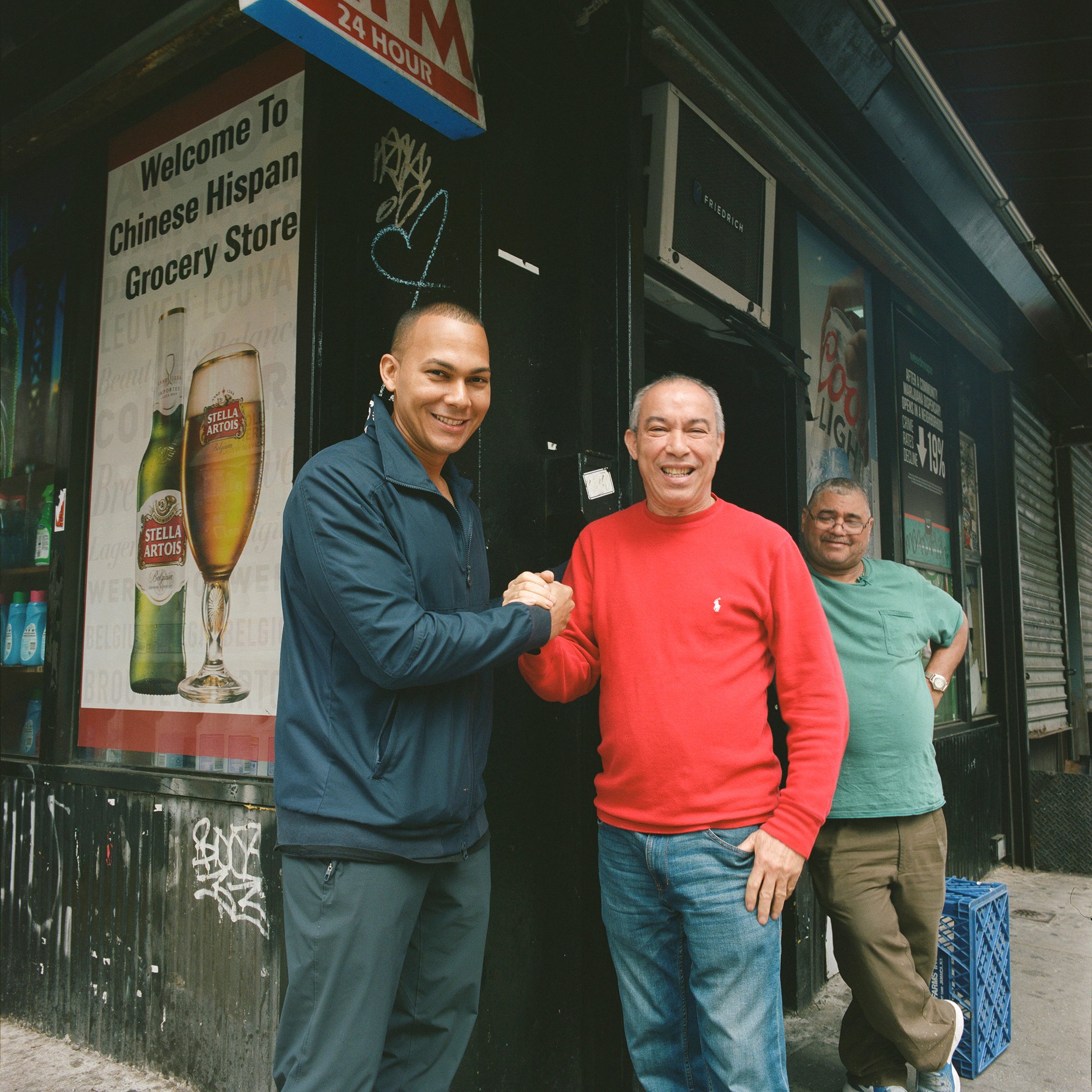 Coss Marte catches up with a friend outside the Chinese Hispanic Grocery on the Lower East Side. At the height of his drug business, Marte would sell drugs on this same corner. Today, he can be spotted working out in the park across the street.