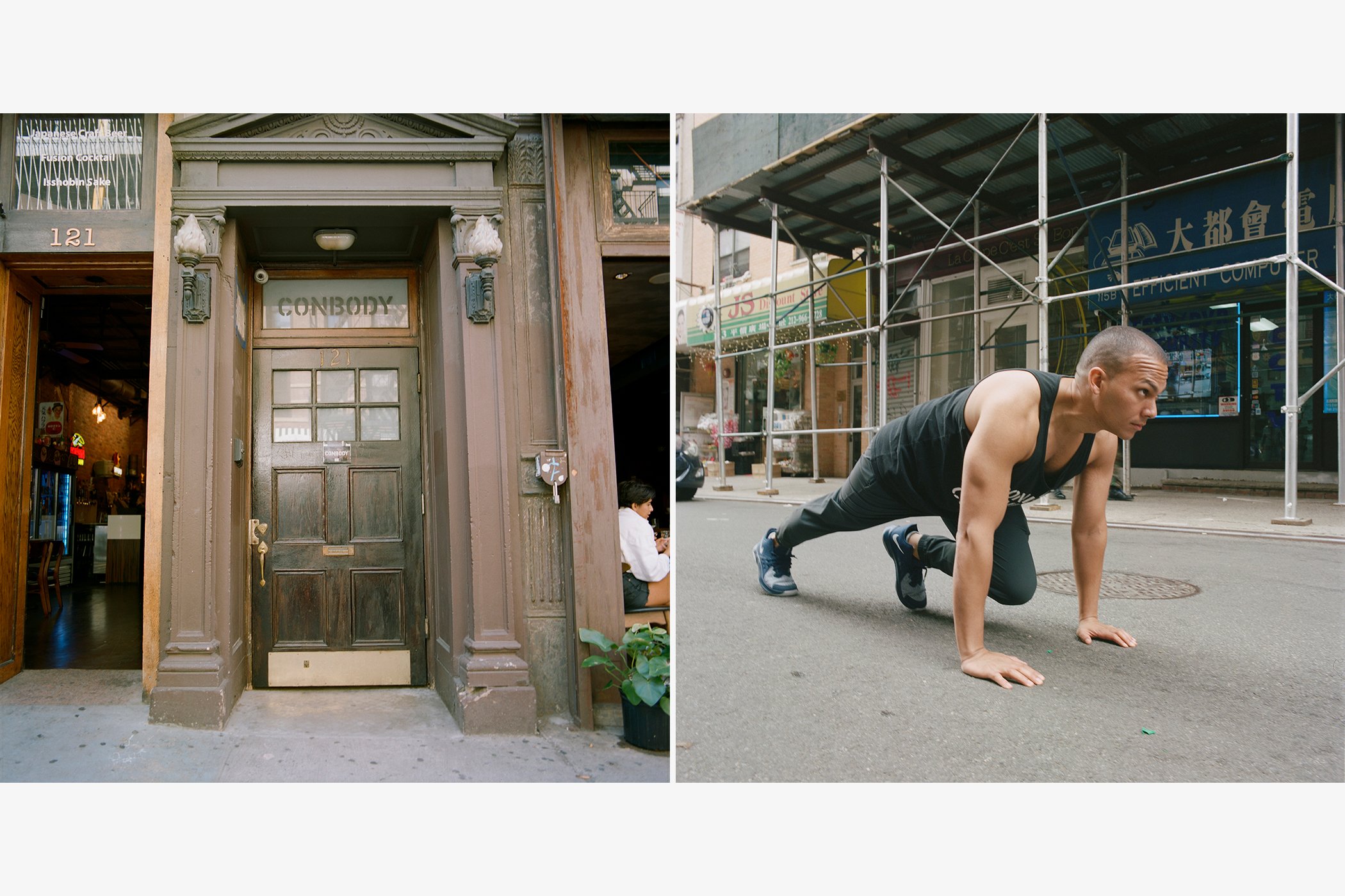 Left: The entrance to ConBody's new location on Ludlow Street. Right: Coss Marte prepares to run in the streets of New York City's Lower East Side.