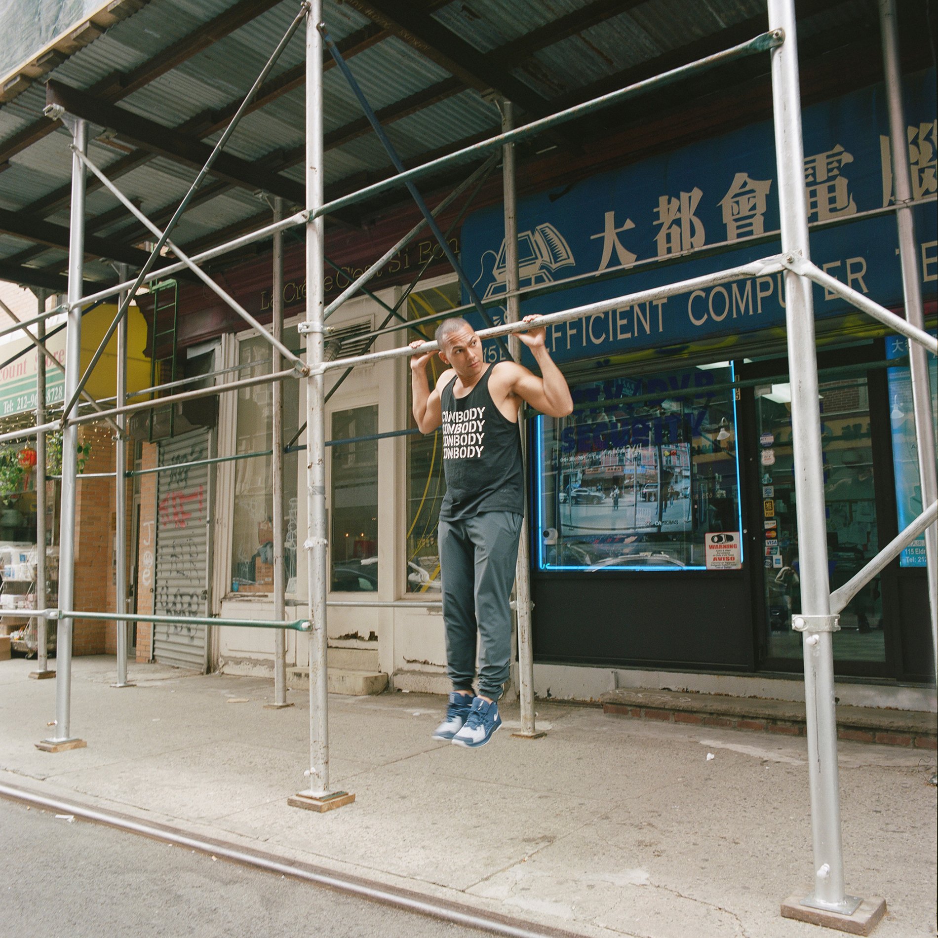Coss Marte, founder of ConBody, does a pull up on the construction scaffolding of a nearby building. The fitness studio offers bootcamp style workouts using bodyweight exercises like those Marte did in his prison cell while incarcerated.