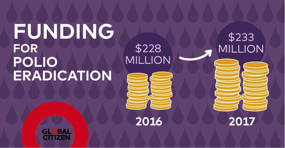 Funding for polio eradication increased from $228 million in 2016 to $233 million in 2017,with $7.5 million earmarked for vital programs in Pakistan and Afghanistan — two of the last remaining countries where polio still causes preventable deaths.
