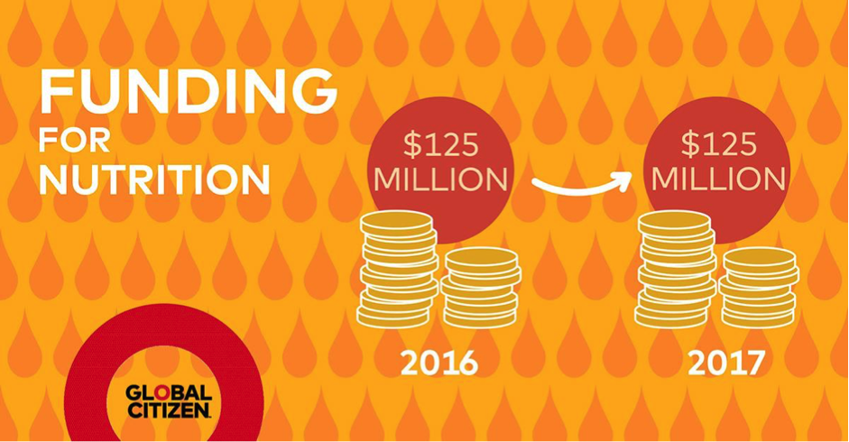 Further, Global Citizen worked with partners like 1000 Days and Bread for the World to advocate for increased funding for global nutrition programs. Congress approved $125 million in funding for nutrition which represents level funding from 2016.