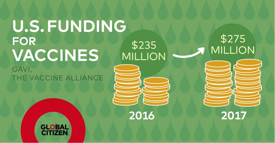 Global Citizen worked closely with key partners like RESULTS and PATH to achieve this outcome. Around the 2016 Global Citizen Festival, 28,250 Global Citizens signed a petition calling on the United States government to increase funding for Gavi, the Vaccine Alliance in 2017. Global Citizen also met with key members of congress to build their support for routine immunization.