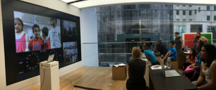 Microsoft’s technology, Skype, connecting students in NY with students in refugee camps across the world on World Humanitarian Day