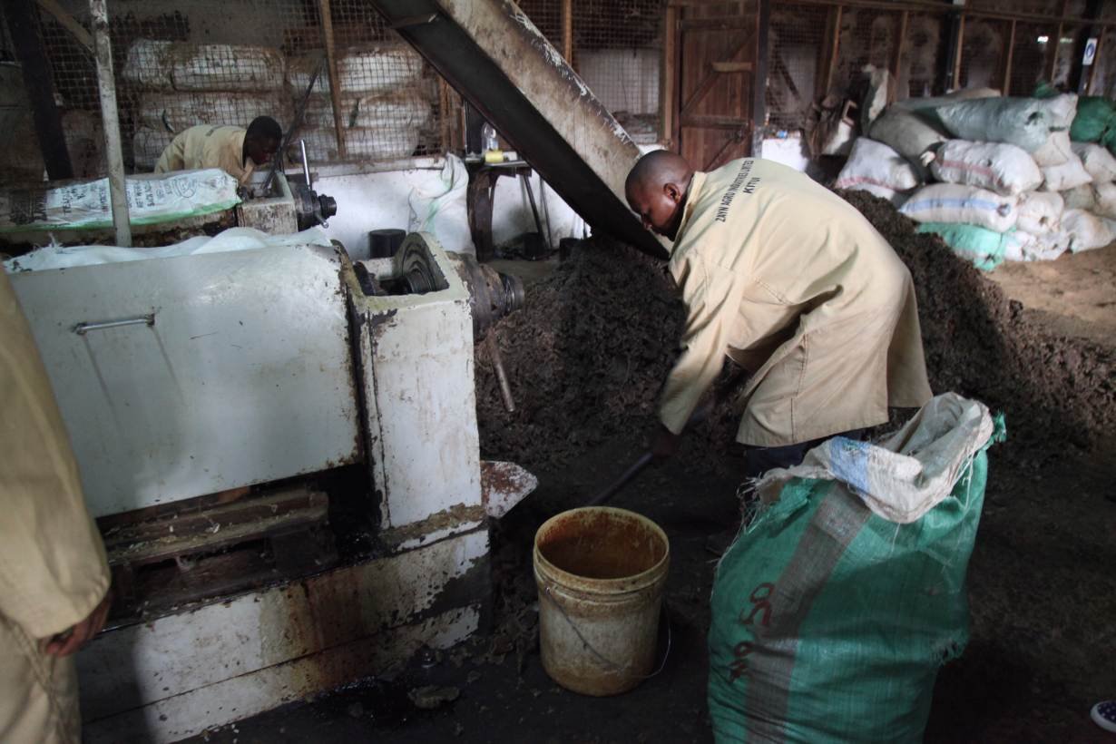 Workers at Zaynagro Industries crush cotton seeds to produce biodiesel in Kenya's Kitui county on May 13, 2019.