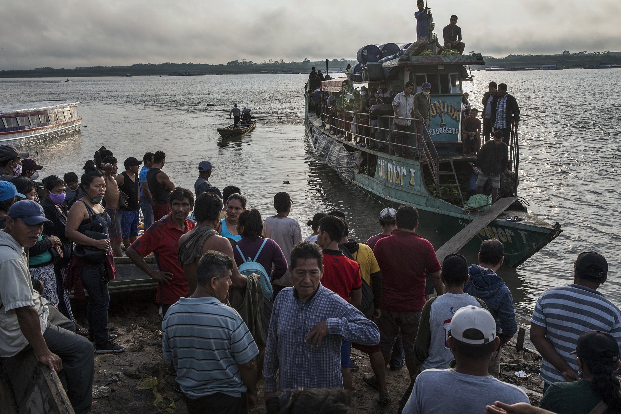 People arrive in a public taxi boat to the Shipibo Indigenous community of Pucallpa, located along the Ucayali River in the Amazonian rainforest of eastern Peru, Sept. 3, 2020. Transportation is one of the biggest hurdles in treating indigenous groups.