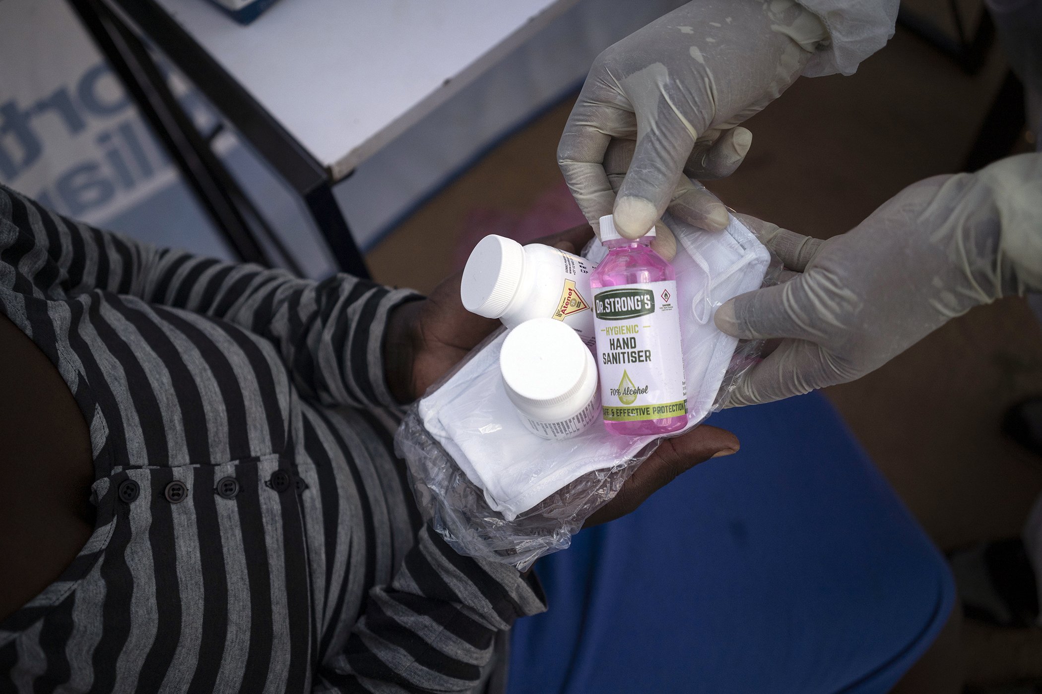 A nurse gives antiretroviral drugs and sanitizer to a patient in Ngodwana, South Africa, July 2, 2020. The COVID-19 pandemic has disrupted the supply of antiretroviral drugs to many of the over 24 million people who take them, endangering their lives. An estimated 7.7 million people in South Africa are HIV positive, the largest number in the world, and 62% of them take the antiretroviral drugs that suppress the virus and prevent transmission.