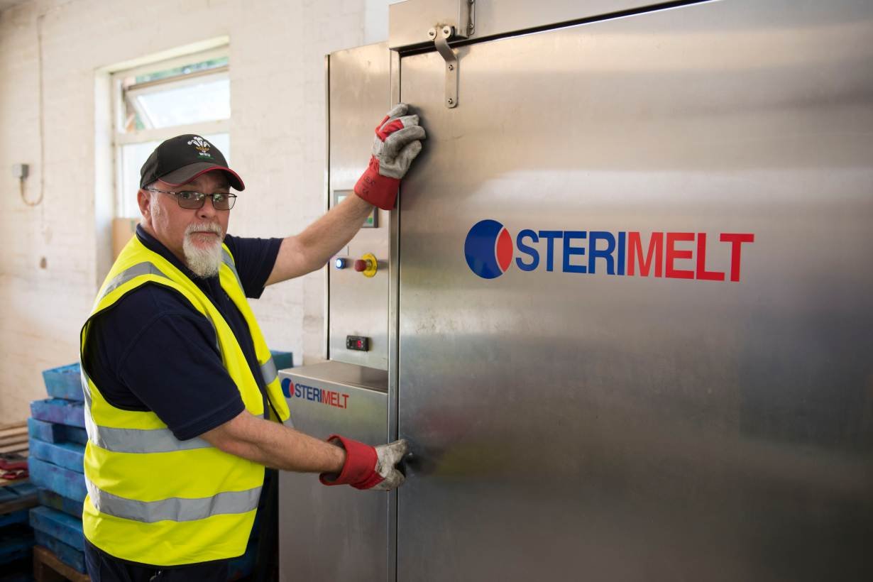 In Wales, Thermal Compaction Group (TCG) makes machines about the size of a large American fridge that melt down hospital gowns, masks, hairnets, tray wraps, and ward curtains into plastic bricks.