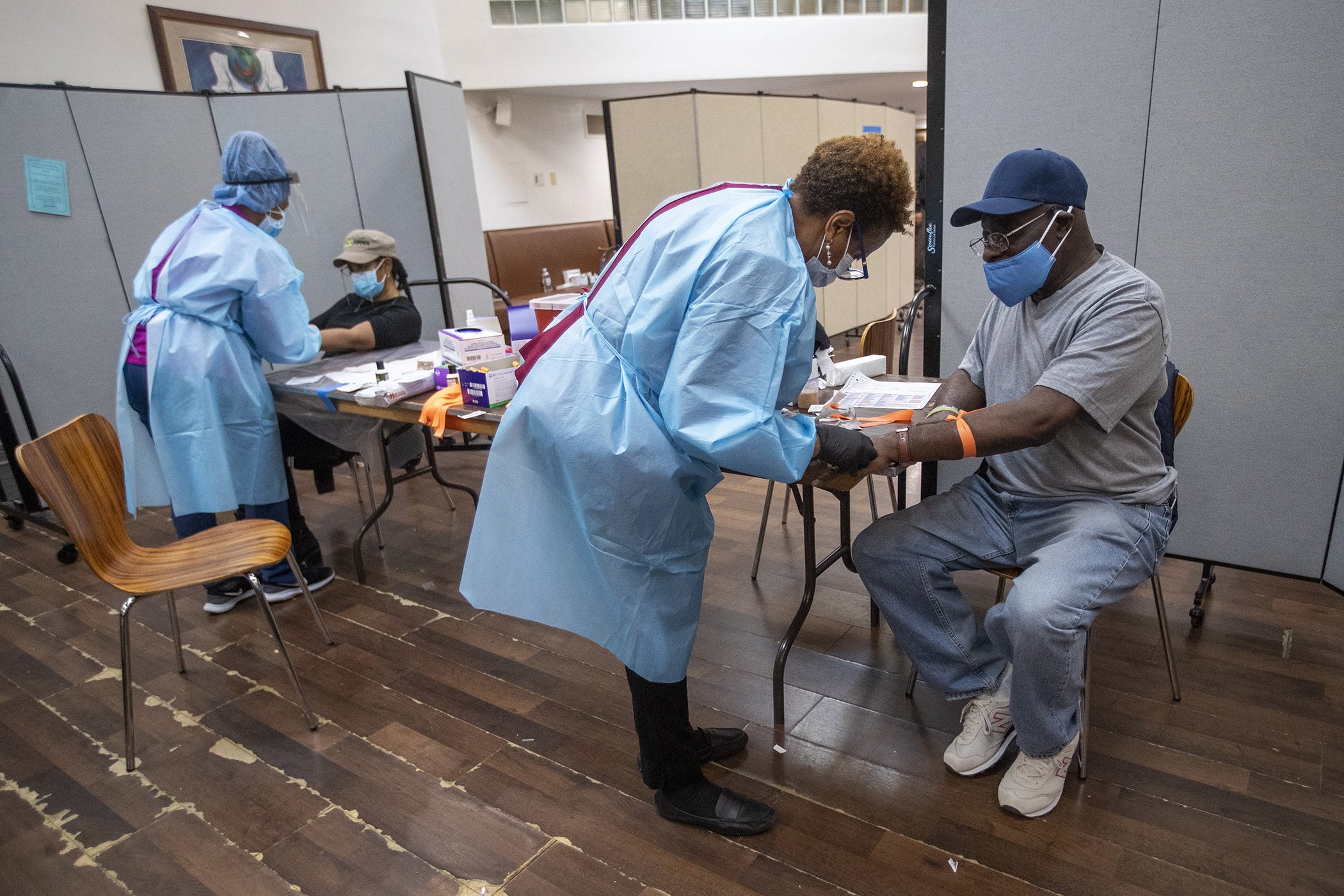 Registered nurses draw blood from patients during a COVID-19 antibody test drive at the Abyssinian Baptist Church, May 14, 2020, in the Harlem neighborhood of the Manhattan.