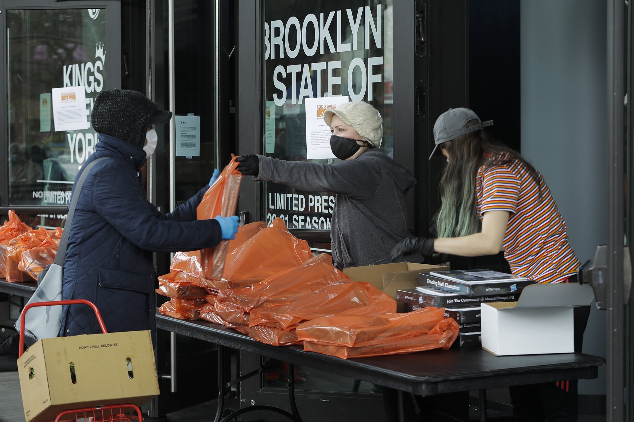 Food Bank for New York City volunteers hand out packages at a mobile food pantry during the coronavirus pandemic at Barclays Center Friday, April 24, 2020, in the Brooklyn borough of New York.