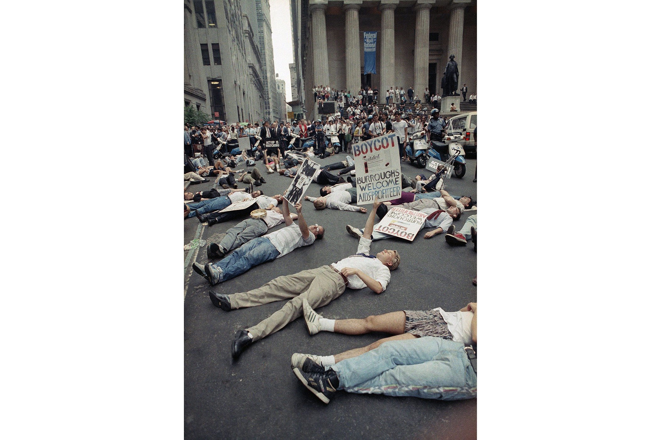 Protesters, organized by the gay rights activist group ACT UP, lie on the street in front of the New York Stock Exchange on Sept. 14, 1989, in a demonstration against the high cost of the AIDS treatment drug AZT.