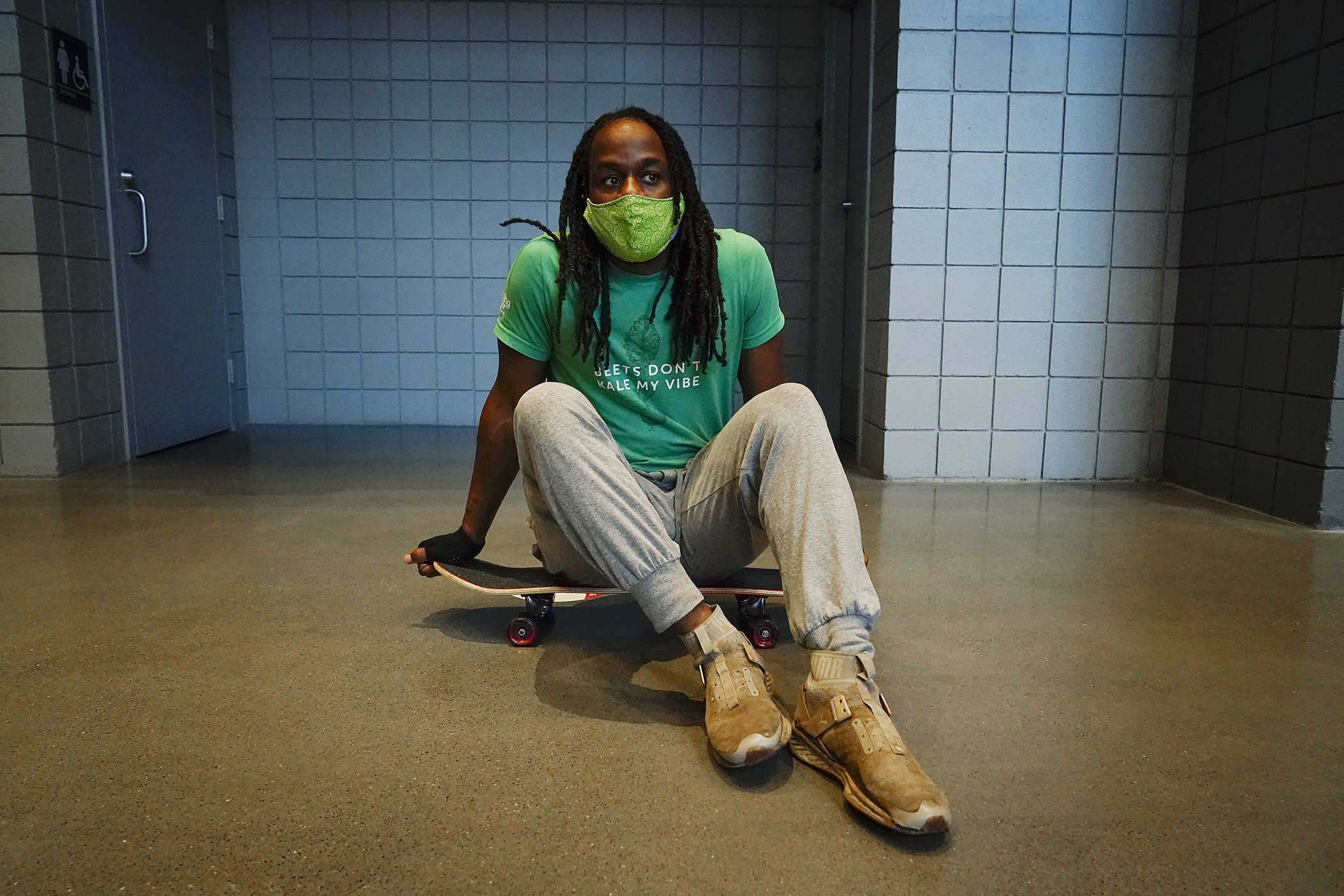 Shawn Walton, 34, of Atlanta, waits in a line to vote early at the State Farm Arena on Oct. 12, 2020, in Atlanta.