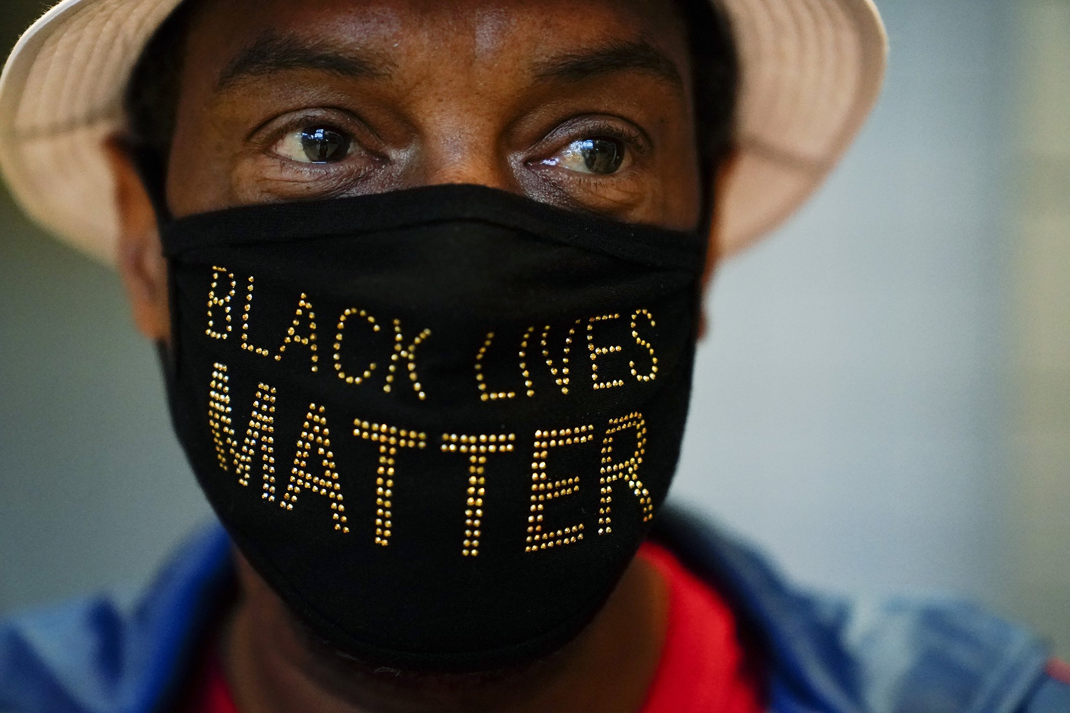 Calvin Stalling, of Atlanta wears a "Black Lives Matter" mask while he waits in a line to vote early at the State Farm Arena on Monday, Oct. 12, 2020, in Atlanta.