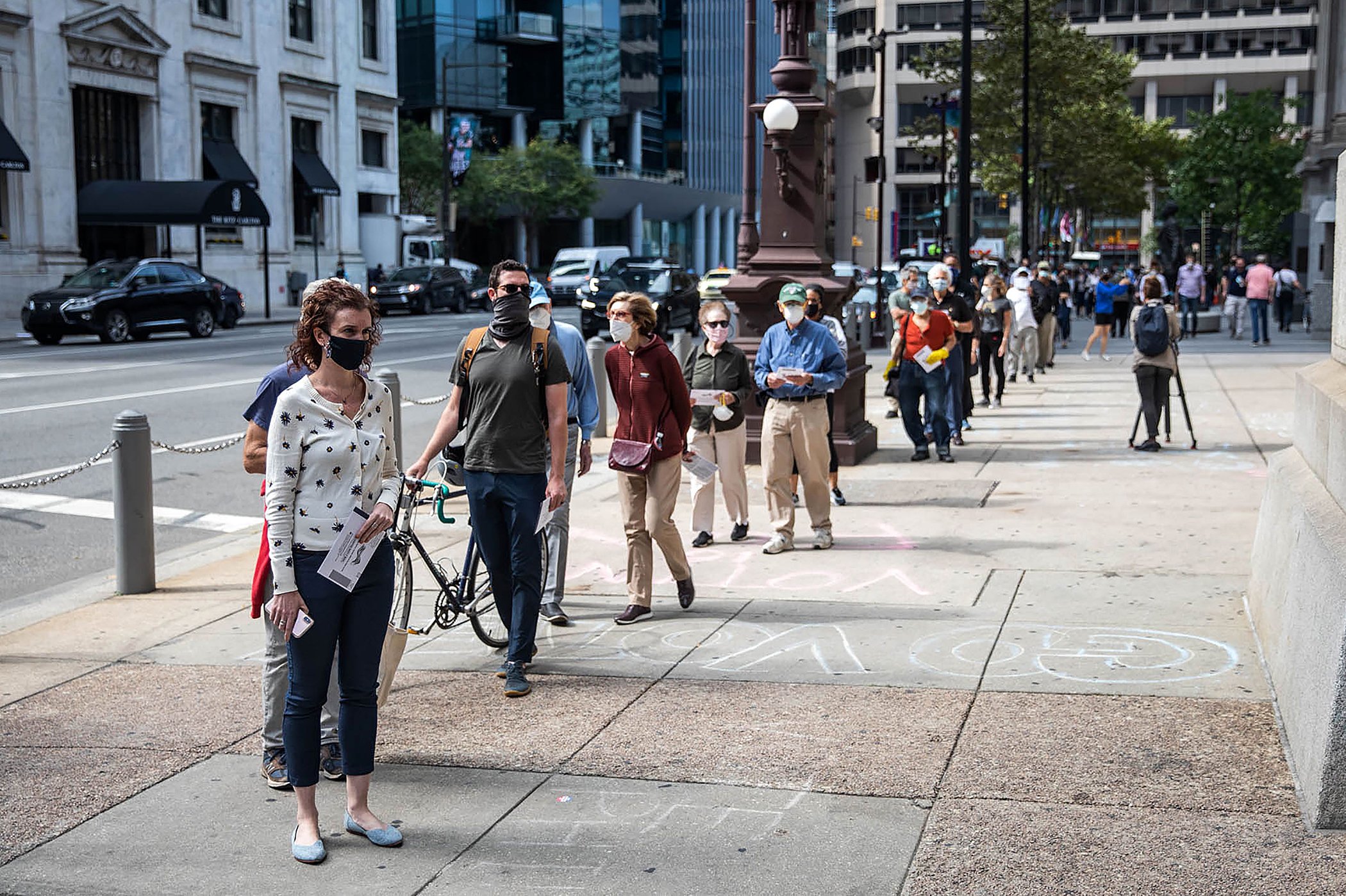 People wait in line to cast their vote during early voting at City Hall in Philadelphia, Pa., on Oct. 7, 2020.