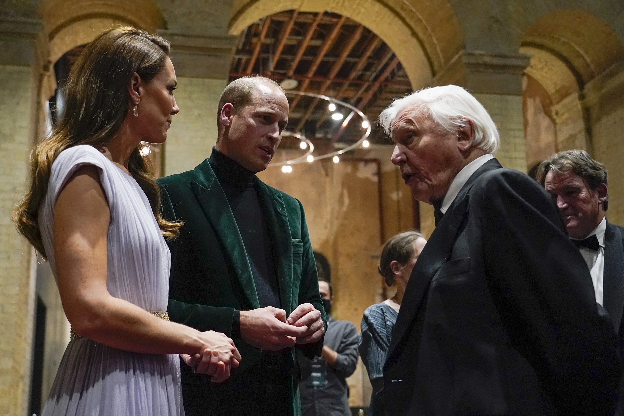 Britain's Prince William and Kate, Duchess of Cambridge talk with broadcaster David Attenborough as they attend the first ever Earthshot Prize Awards Ceremony at Alexandra Palace in London on Sunday, Oct. 17, 2021.