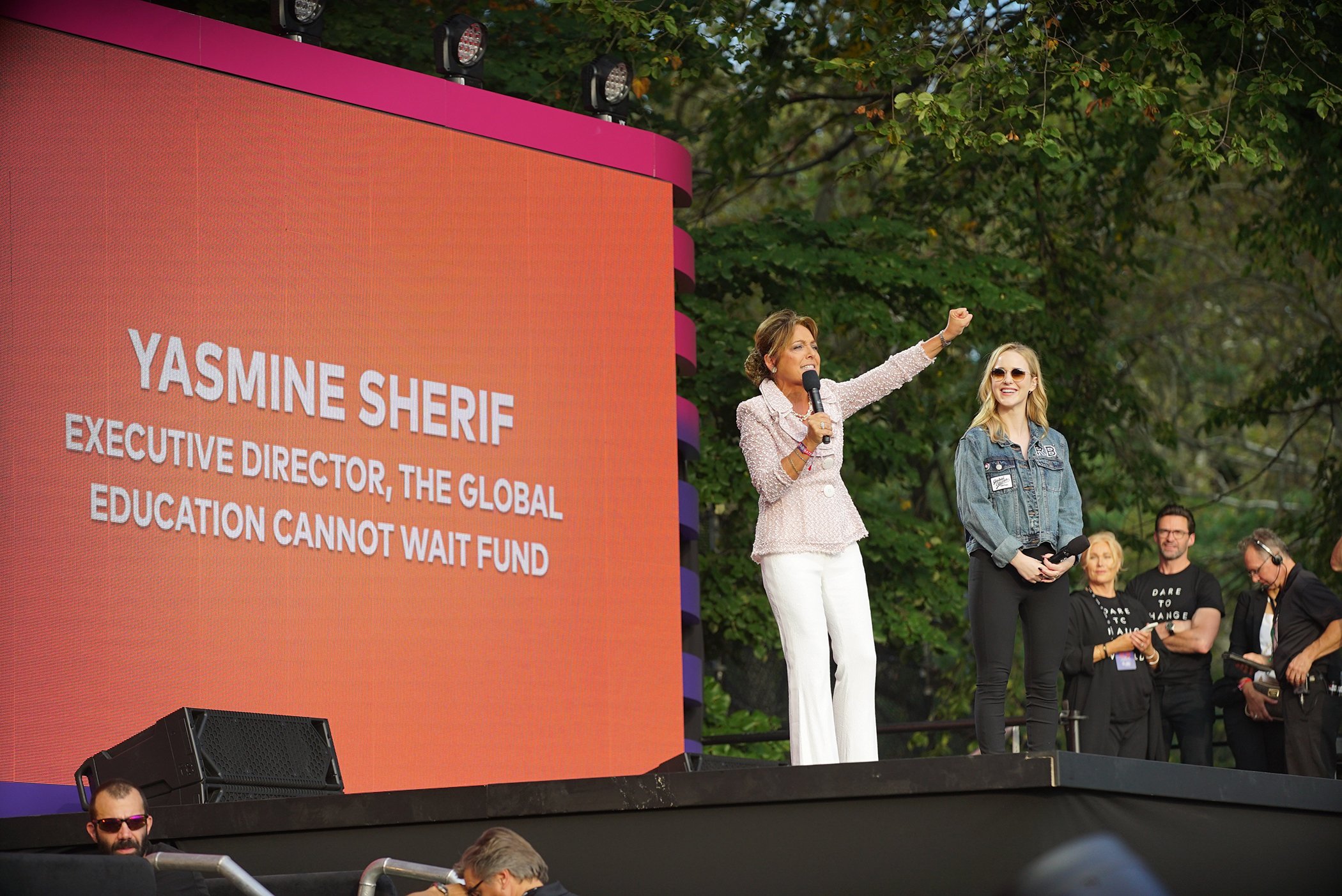 Actress and Global Citizen Ambassador Rachel Brosnahan joined Yasmine Sherif, director of the Education Cannot Wait (ECW) fund, on stage at the 2019 Global Citizen Festival in New York City’s Central Park on Saturday to thank Global Citizens.