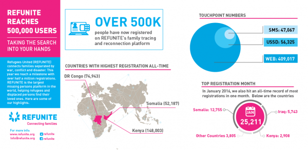 Just a couple of weeks ago, REFUNITE crossed a remarkable milestone in our relatively short history: the 500,000th displaced person looking for missing family was brought onto our platform. How did we achieve this? Through using mobile phone technology and distributing the family tracing process to the refugees themselves.