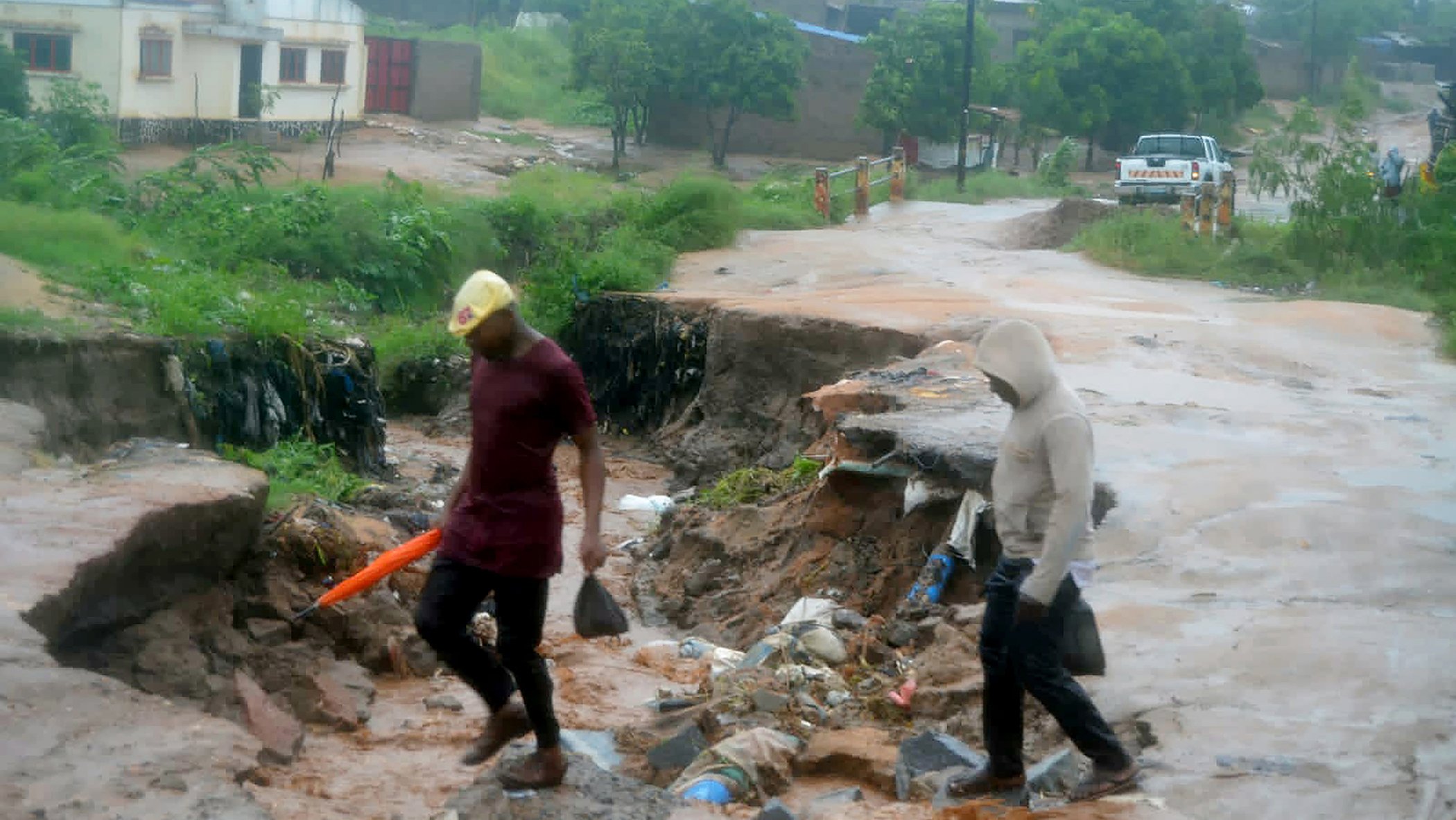 People make their way along a damaged section of a road in Nampula Province, Mozambique, March 12, 2022. Officials in Mozambique say that Cyclone Gombe has flooded large areas of northern and central Mozambique, killing more than 10 people.