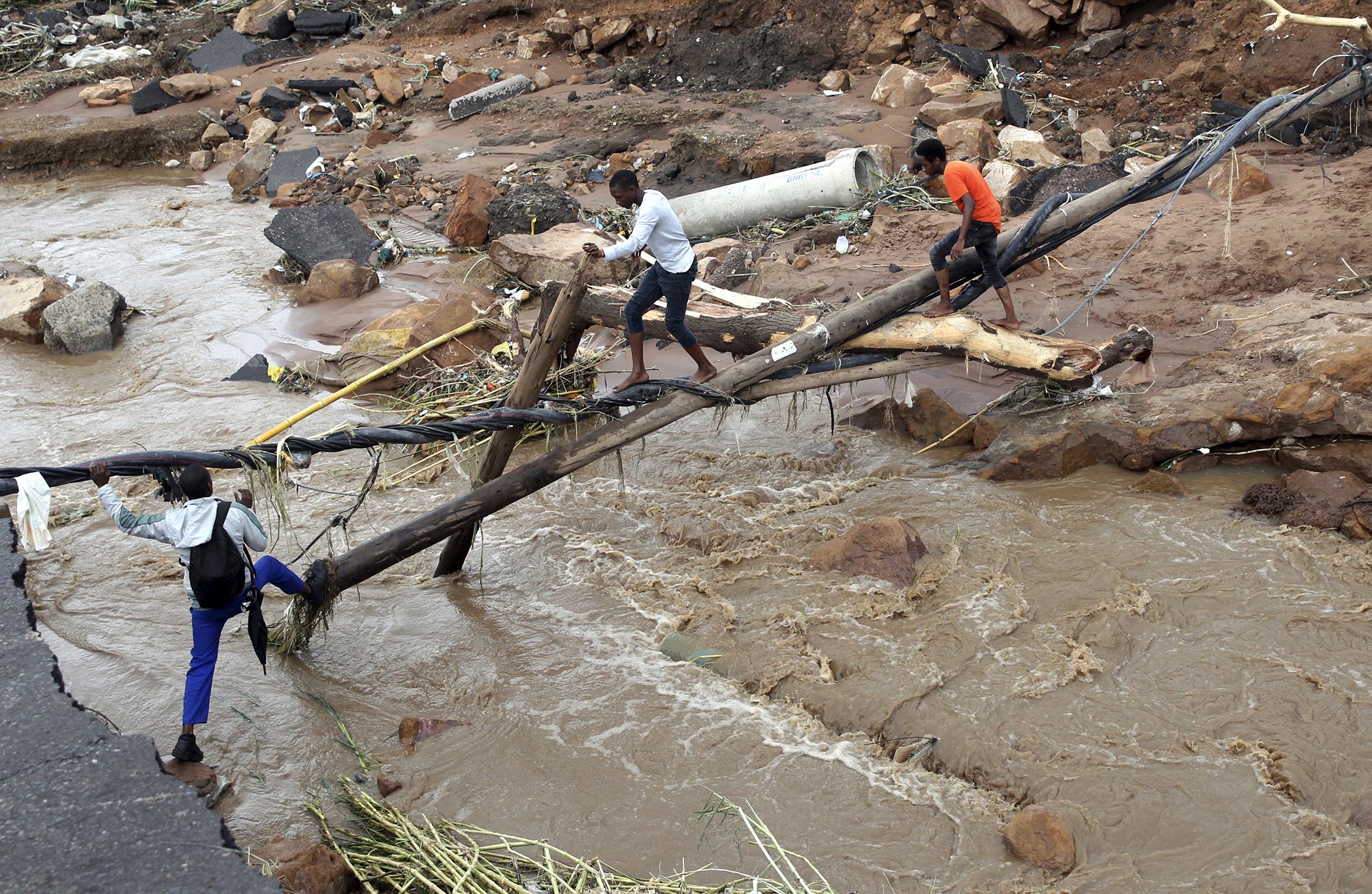 People try to cross over a river after a bridge was swept away in Ntuzuma, outside Durban, South Africa, April 12, 2022. According to reports, prolonged rains and flooding in South Africa's KwaZulu-Natal province have claimed the lives of 300 people.