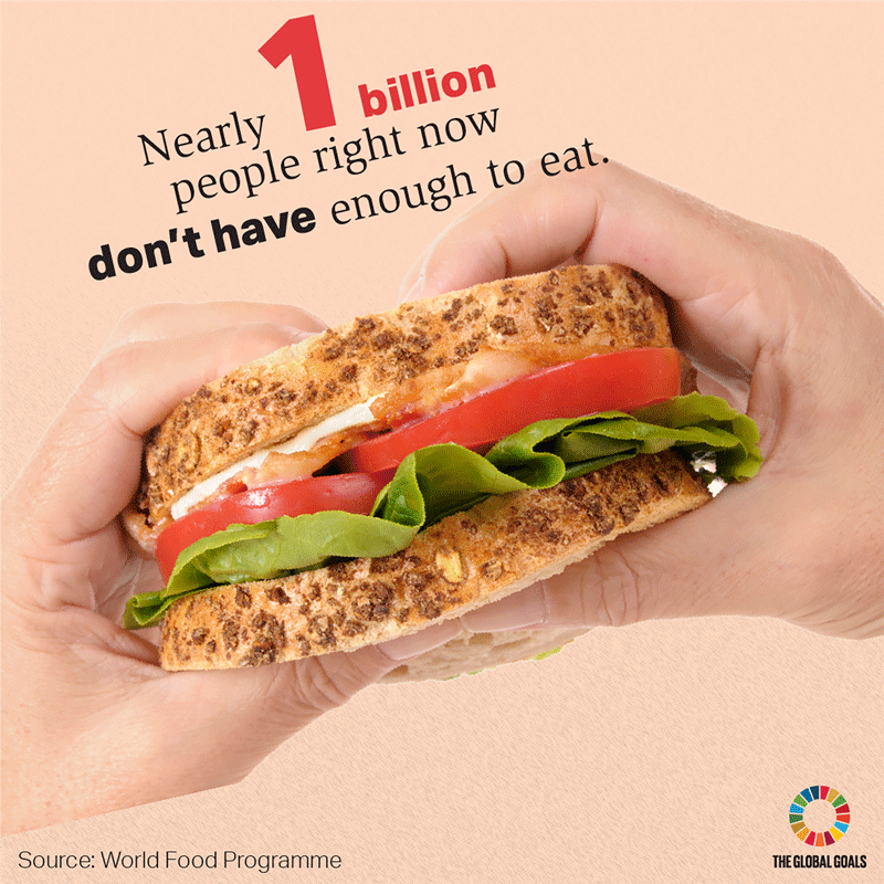 The UN aims to end hunger, achieve food security, improve nutrition, and sustainable agriculture by 2030. To help realize these goals, you can eat more sustainably, buy local or fair-trade food, and try not to waste any food.