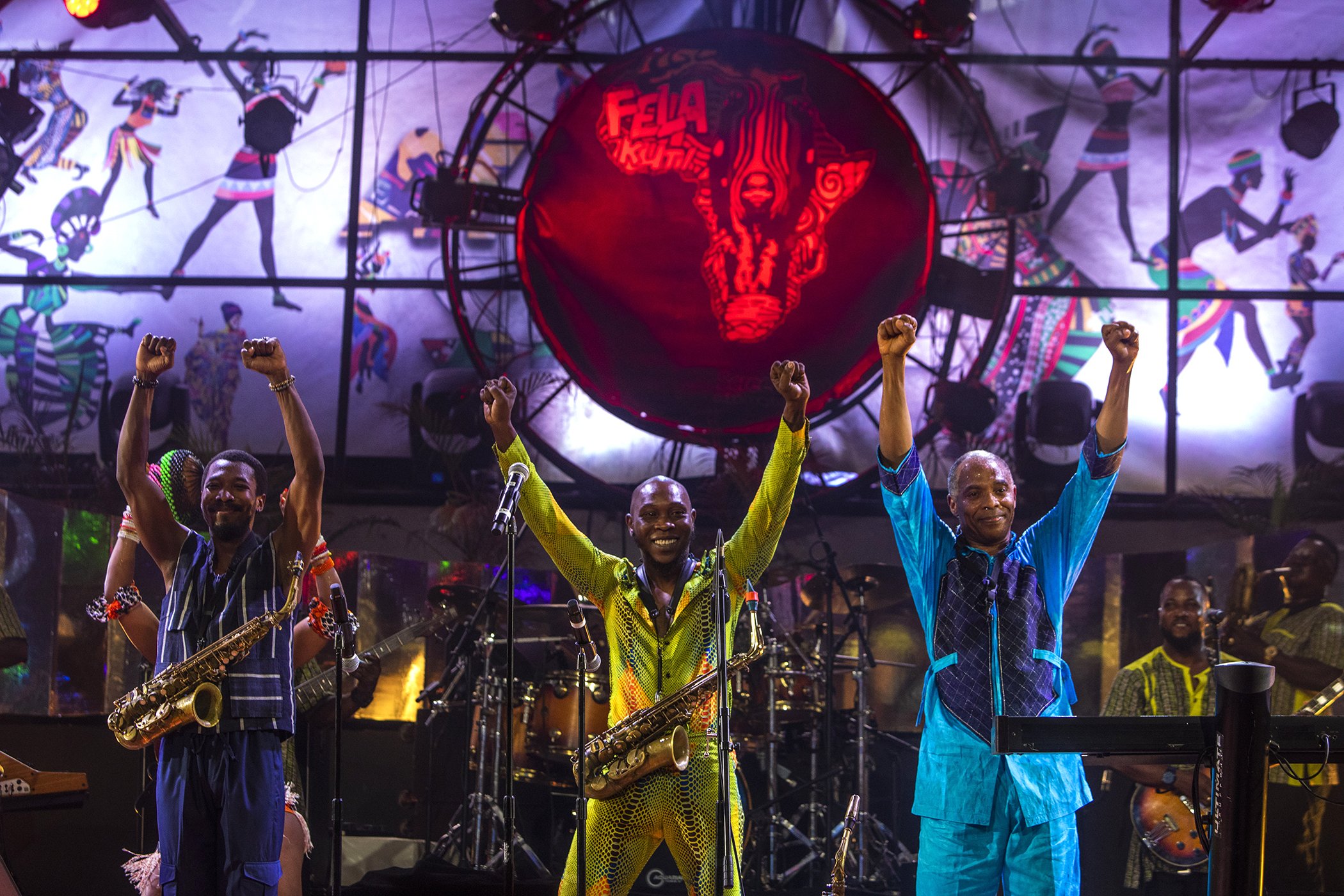 (L-R) Made Kuti, Seun Kuti, and Femi Kuti perform during Global Citizen Live at The New Africa Shrine Lagos, Nigeria.