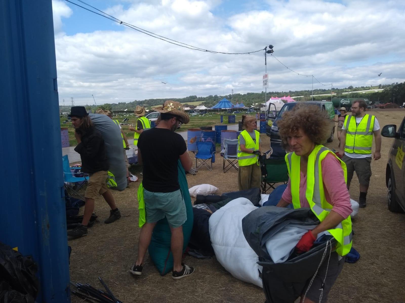 At Glastonbury, the first stop on their festival tour, volunteers gathered some 300 sleeping bags, duvets, and blankets; 150 roll mats; 120 tents; 75 tarps; 20 water carriers; 260 chairs; 30 pillows; and 250 mattresses, according to Help Refugees.