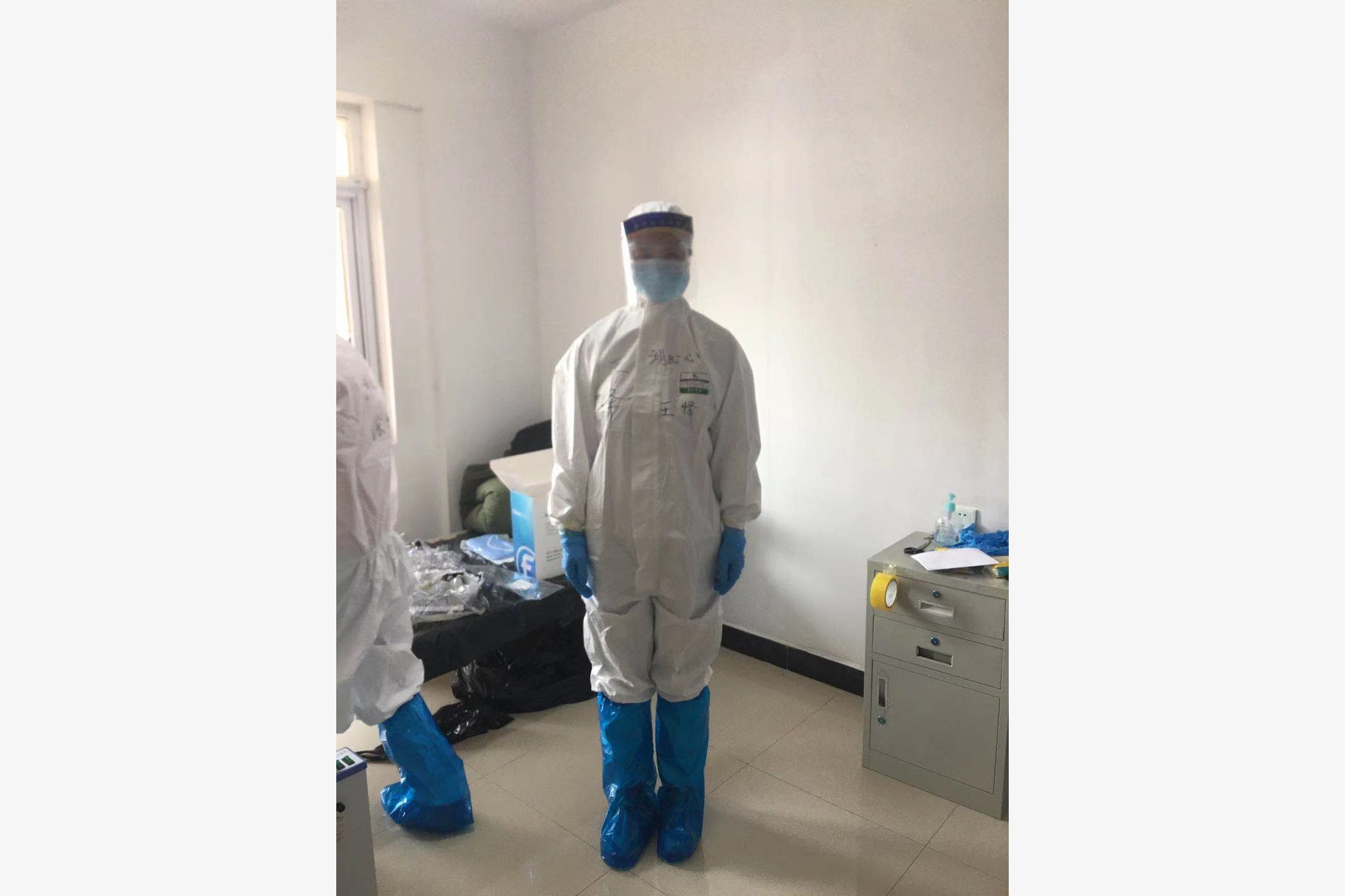 Alongside medical staff in the quarantine unit, Yi wore a face mask, shield, goggles, gloves, a hazmat suit, and boots.