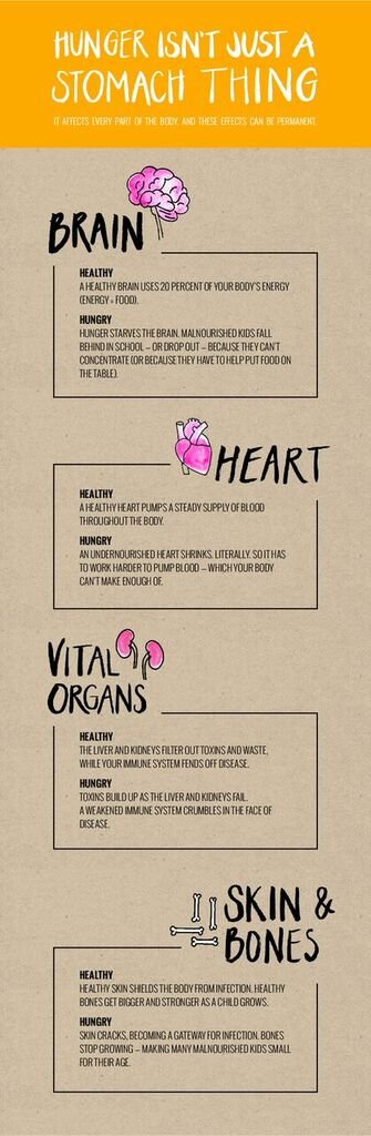 It turns out hunger doesn’t just affect how we learn or pay attention in school – it also affects how well our brain works or develops. A healthy brain uses 20% of the body’s energy, and energy comes from food. That means that hunger starves the brain.