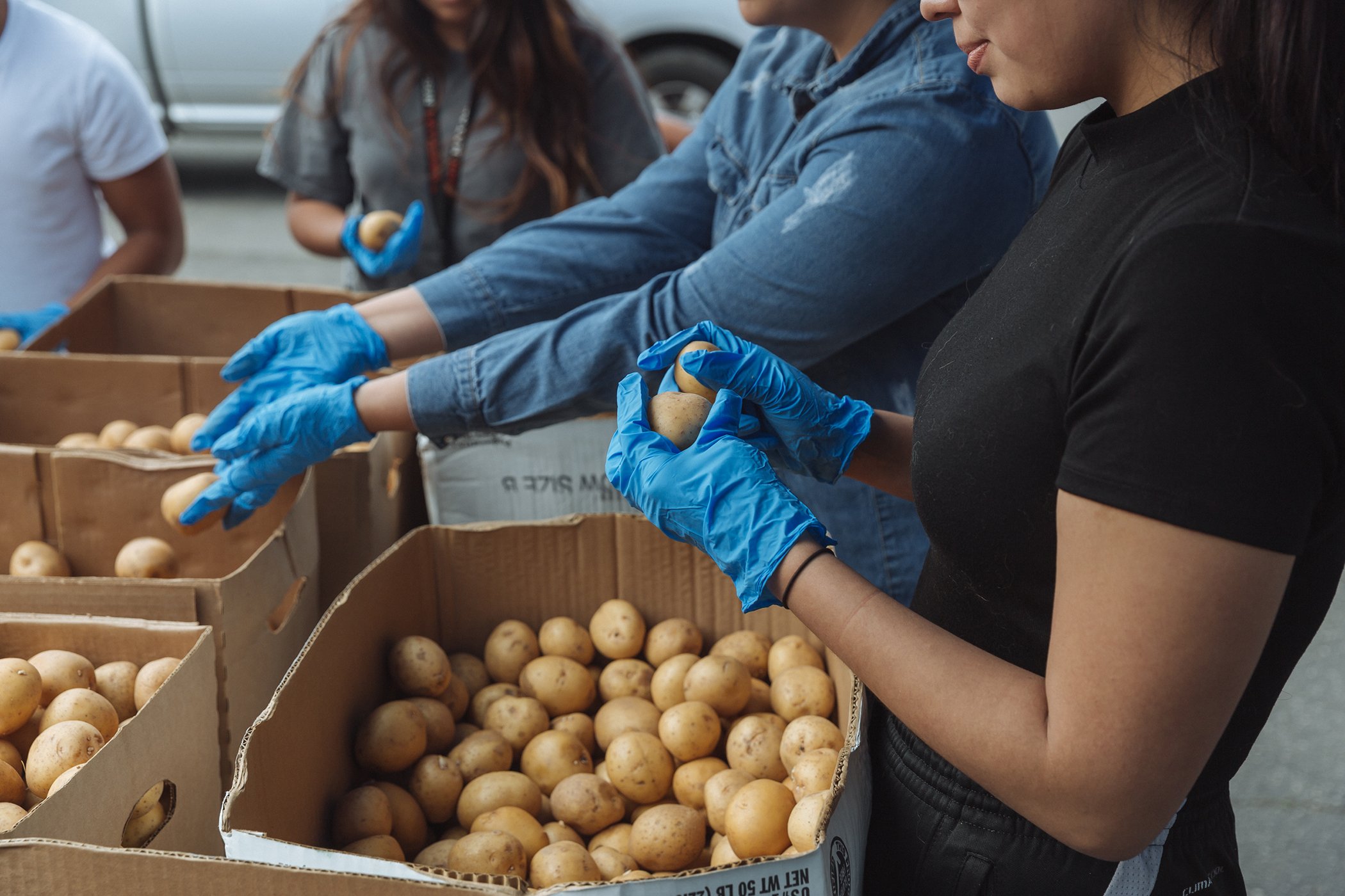 Volunteers glean potatoes recovered before they became food waste at a community event run by nonprofits SJLI and Food Forward, which invites members of the Inglewood community to bring home fresh produce.