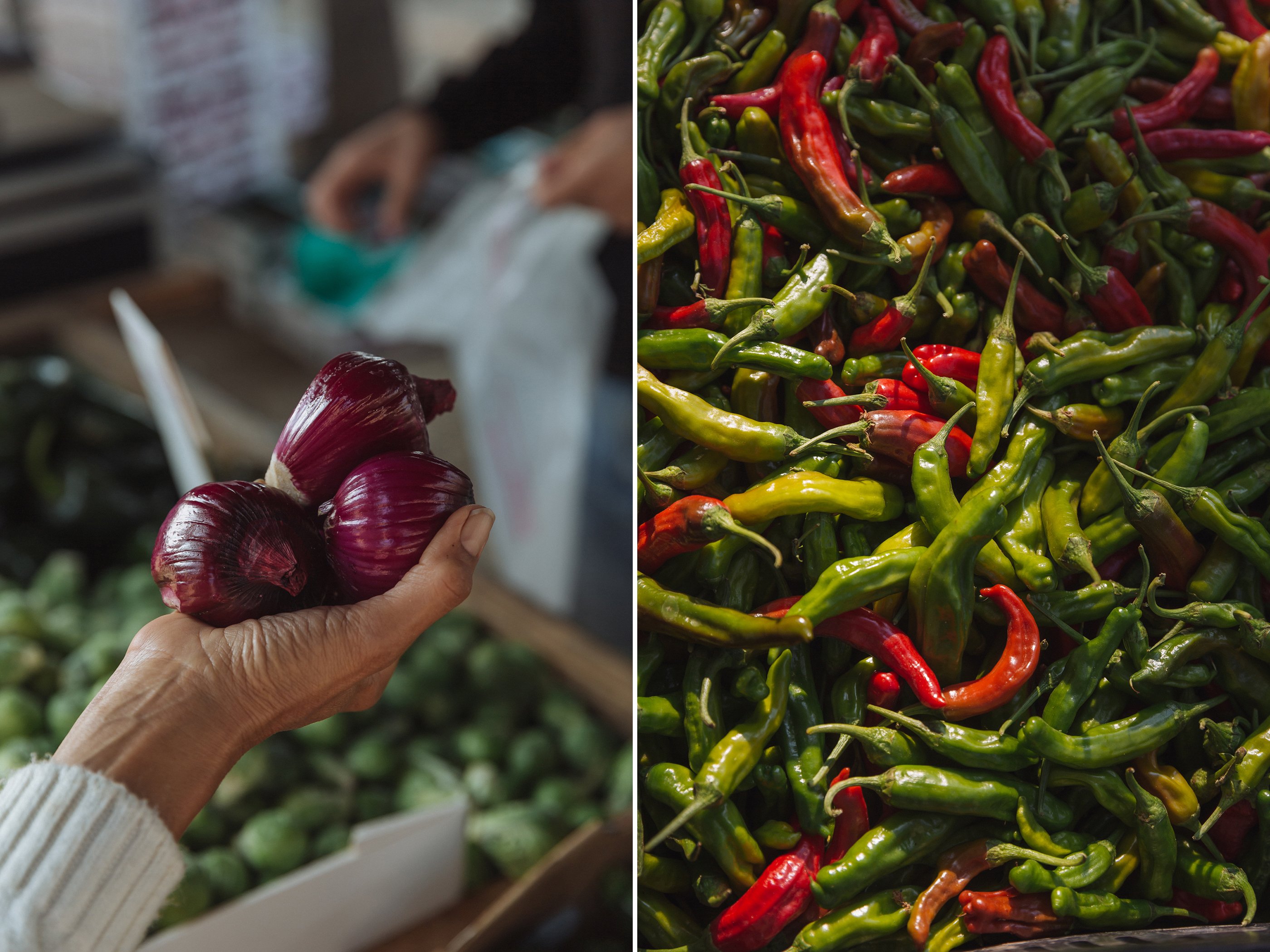 (L) Lynetta buying onions through the Market Match Program. (R) Fresh produce at the Pico Boulevard farmers market.