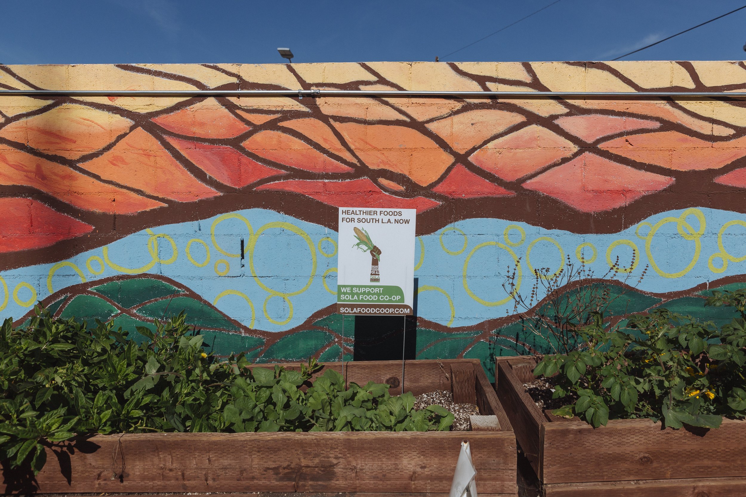 A sign in the garden of SJLI's office advocates for healthier food options in South Los Angeles, home to many food deserts. The area has many fast food restaurants, convenience stores, and liquor stores, but fewer supermarkets.