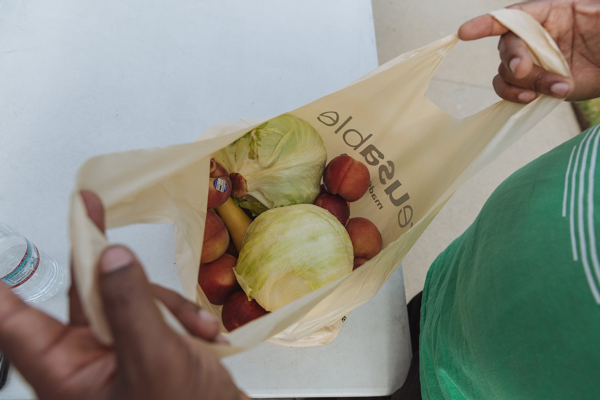 A volunteer packs fruits and vegetables rescued from becoming food waste into free bags for families from Inglewood, a low-income city in LA County. The city has limited access to healthy produce and more than 20% of its residents are living in poverty.