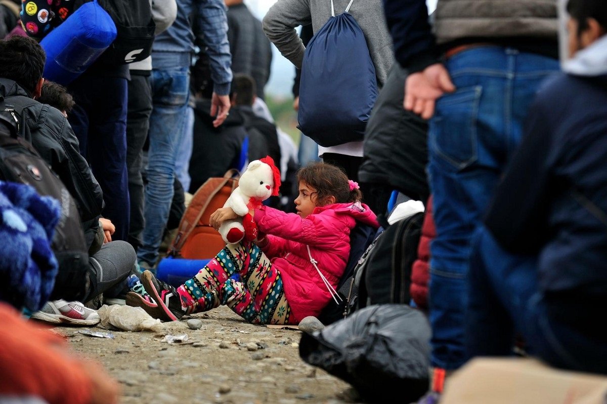 A girl sits on the ground and plays with her toy bear, as people queue around her at the Vinojug reception centre near the town of Gevgelija, in the former Yugoslav Republic of Macedonia. Waiting for long hours can be wearying for children without the companionship of their friends.