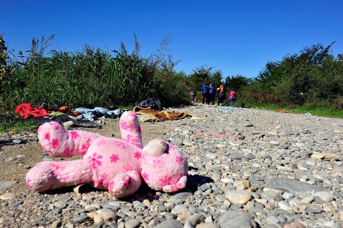 An abandoned toy lies covered in dust on a road used by refugees making their way from Greece near the border town of Gevgelija in the former Yugoslav Republic of Macedonia, as one of the comforts of childhood is left behind.