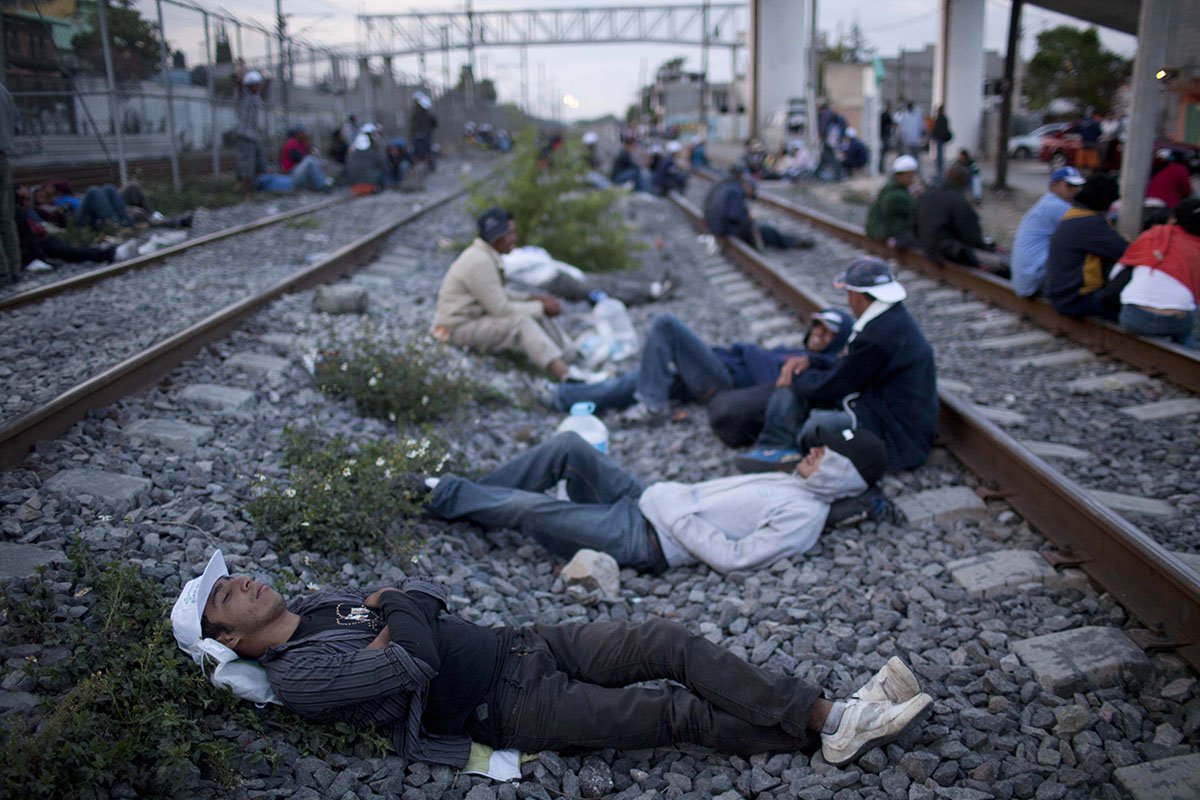 In this May 17, 2012 photo, migrants, mostly from Honduras, rest on railroad tracks as they wait for a train headed north, in Lecheria, on the outskirts of Mexico City. While the number of Mexicans heading to the U.S. has dropped dramatically, a surge of Central American migrants is making the 1,000-mile northbound journey this year, fueled in large part by the rising violence brought by the spread of Mexican drug cartels.