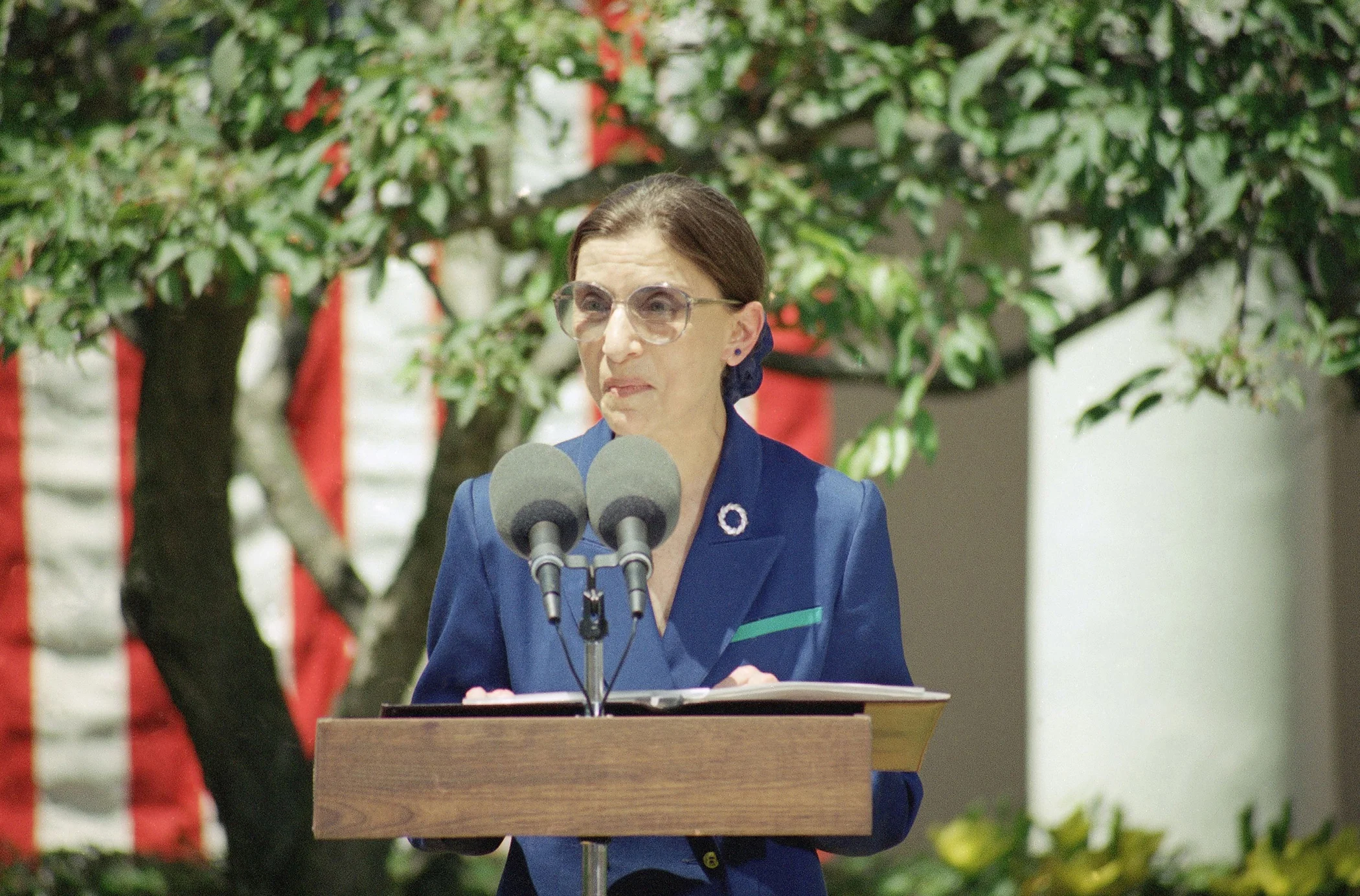 Judge Ruth Bader Ginsburg addresses reporters in the Rose Garden of the White House on June 14, 1993 in Washington after President Bill Clinton said he would nominate the judge for the Supreme Court.