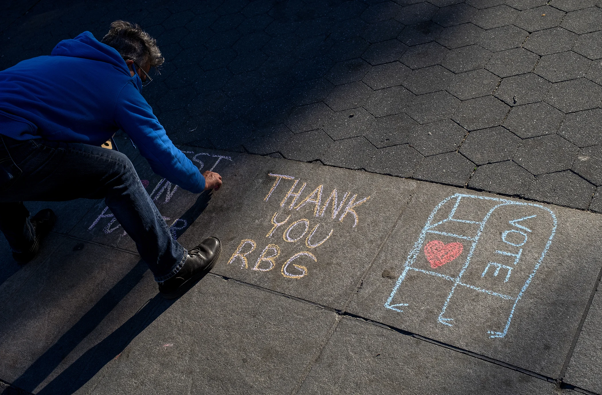 Kimberly Miller leaves a chalk message honoring Justice Ruth Bader Ginsburg on a Washington Square Park walkway in New York, Sept. 19, 2020, a day after the death of the Supreme Court justice.