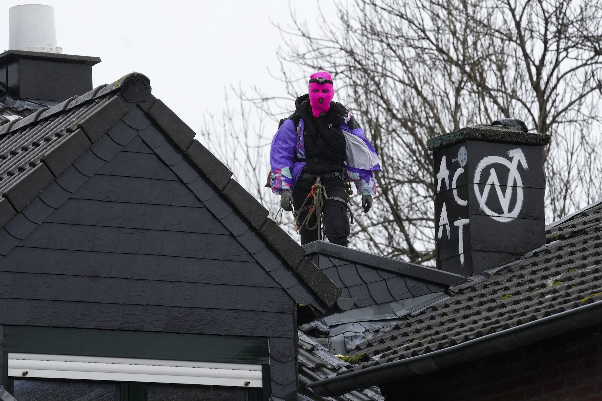 A masked climate activist stands on a roof top at the village Luetzerath, near Erkelenz, Germany, Thursday, Jan. 12, 2023. Police have entered the condemned village in to evict the climate activists holed up at the site in an effort to prevent its demolition, to make way for the expansion of a coal mine.