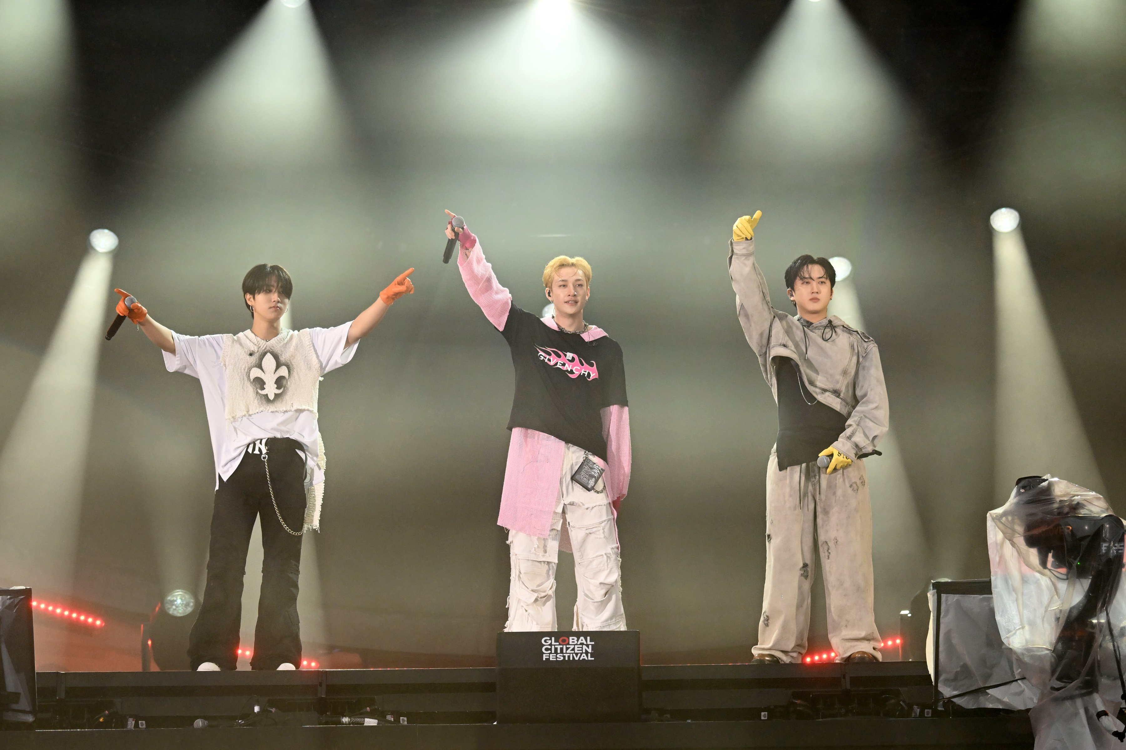 (L-R) Han, Bang Chan and Changbin, of 3RACHA, perform onstage for the first time at Global Citizen Festival 2023 at Central Park on September 23, 2023 in New York City.