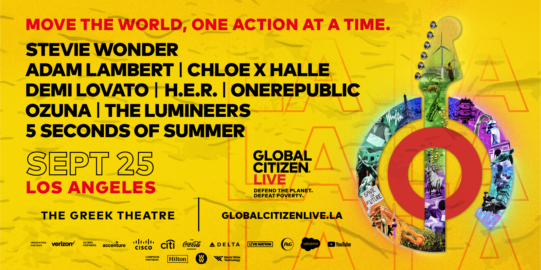 Presented by Verizon, Global Citizen Live in Los Angeles will take place on an outdoor stage at the Greek Theatre, and will be headlined by Global Citizen veteran Stevie Wonder, joined by Adam Lambert, Chloe x Halle, Demi Lovato, H.E.R., ONEREPUBLIC, Ozuna, The Lumineers, and 5 Seconds of Summer.