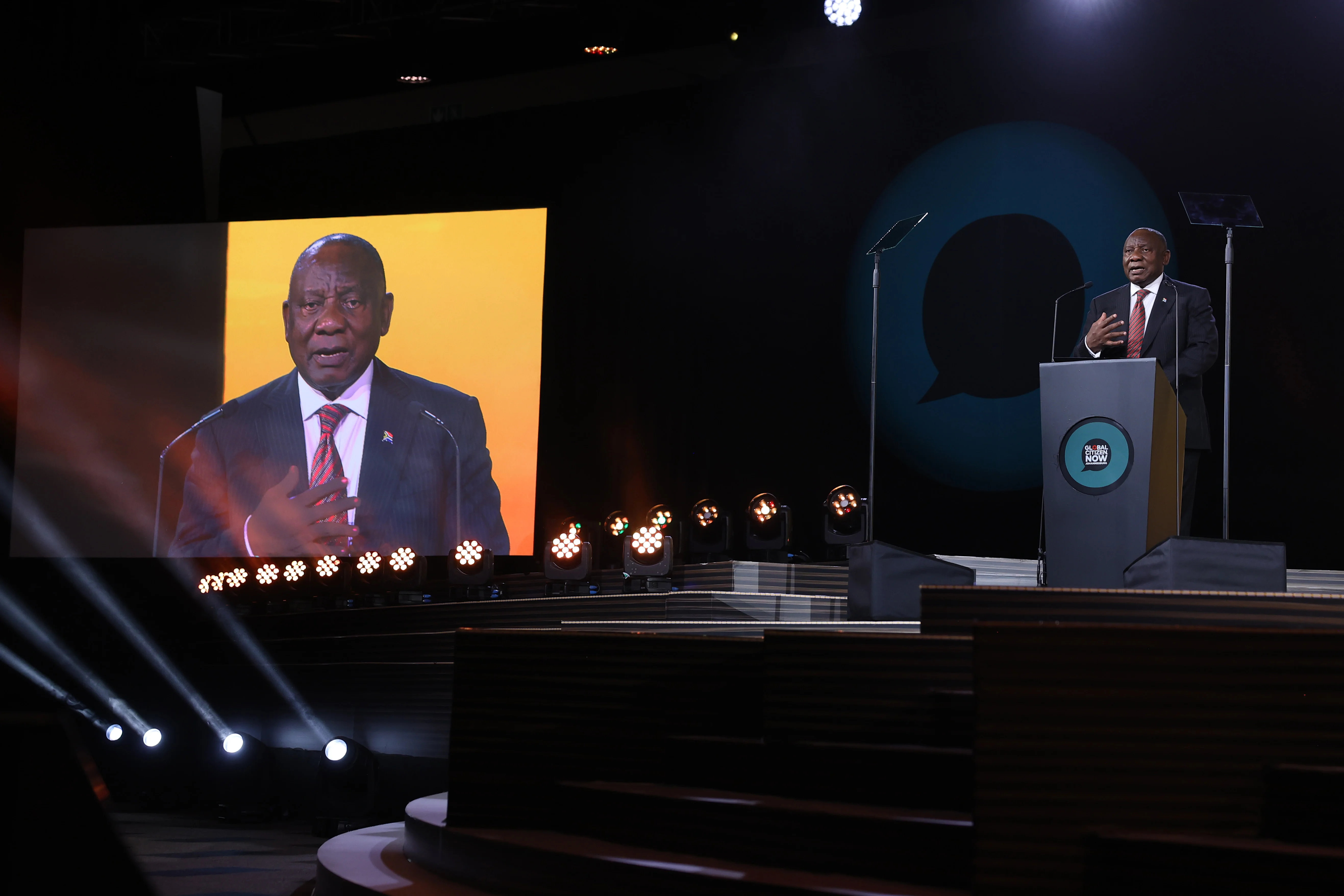 Cyril Ramaphosa, President of the Republic of South Africa speaks on stage during Global Citizen NOW: Johannesburg. Jemal Countess/Getty Images for Global Citizen
