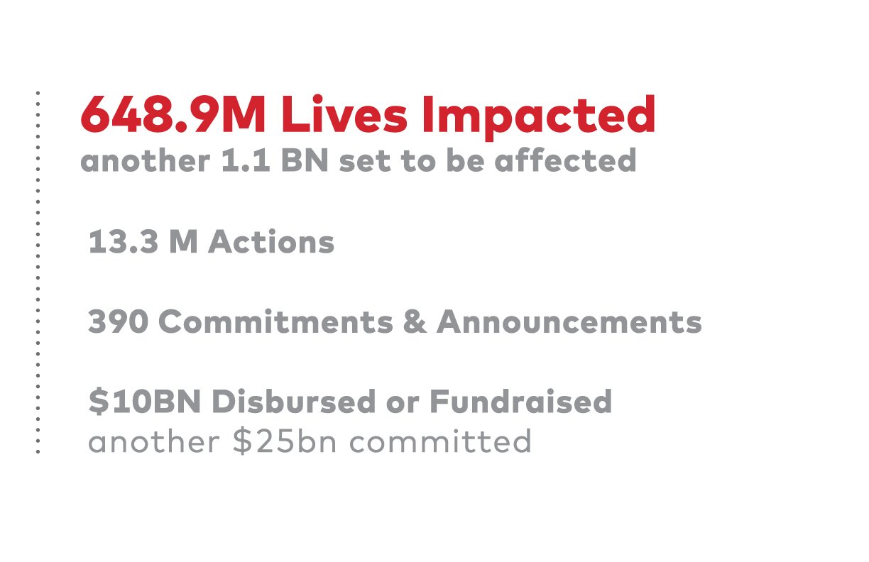 The lives impacted numbers are retrieved through a variety of sources including: publicly available information concerning the commitments and announcements, the commitment makers, the organizations contracted to deliver commitments on behalf of commitment makers, and credible outside sources we believe to be reliable sector experts with access to relevant information.