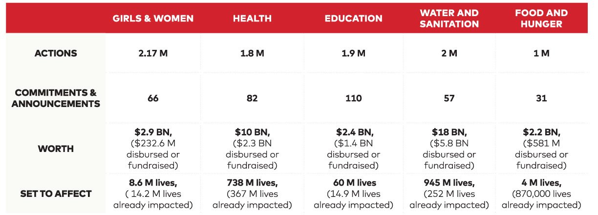 The commitments are valued at more than $35 billion, of which $10 billion has already been disbursed — all commitments recorded are new commitments that were announced on a Global Citizen stage or were driven in a significant way by the actions of Global Citizens, as well as our own high level advocacy efforts, conducted with partners.