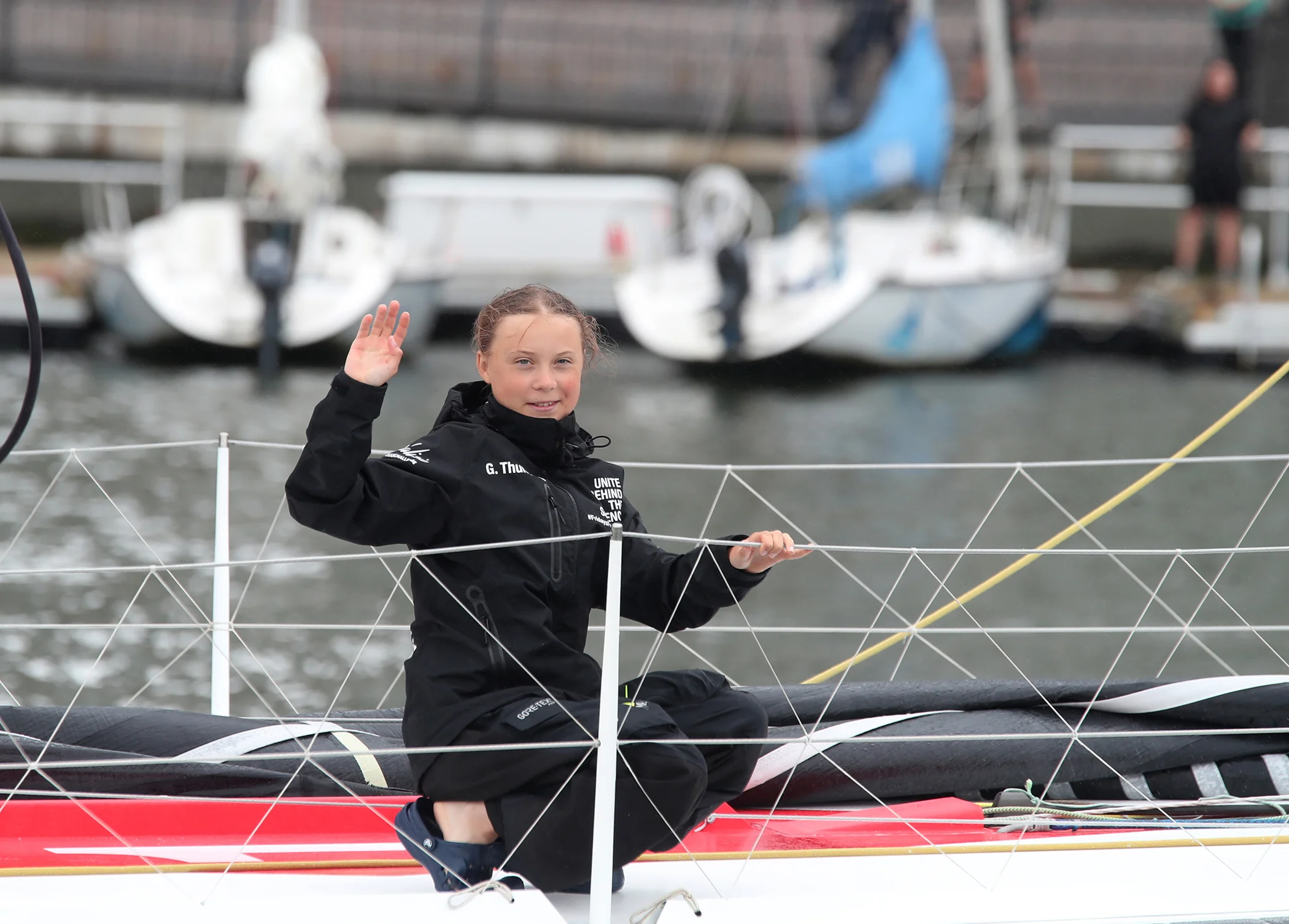 Greta Thunberg, a 16-year-old Swedish climate activist, waves after sailing in New York harbor aboard the Malizia II, Aug. 28, 2019.