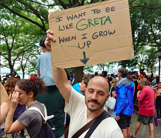 Students Katharina and Nicholas Klag said they had attended several Fridays for Future events in Germany and were excited to support Thunberg in New York. Bernice Gordon, whose grandchildren have been inspired by the youth activist, said that Thunberg is "brilliant and prophetic." Nabil Viñas held a sign that said, "I want to be like Greta Thunberg when I grow up."